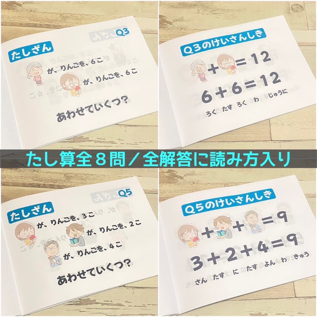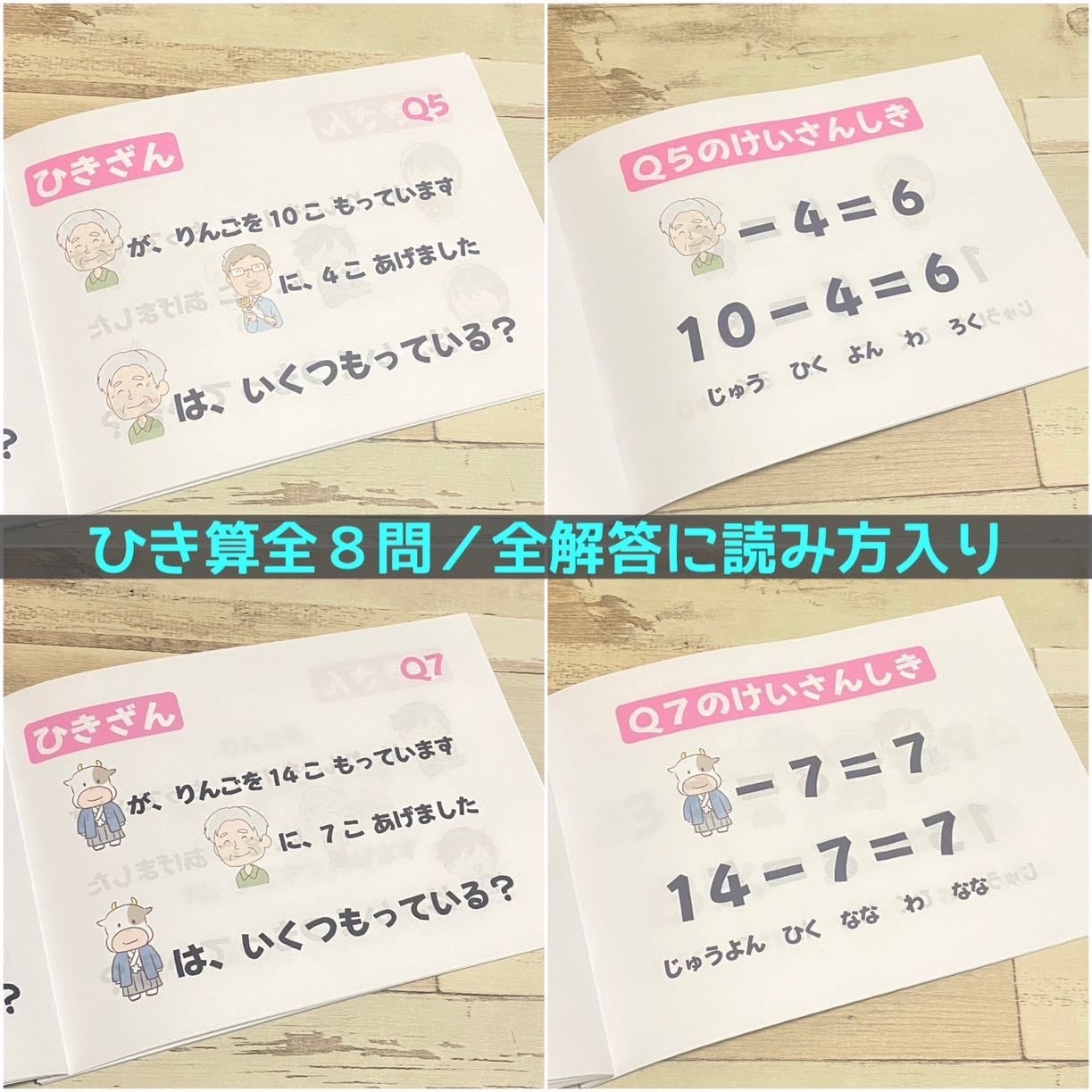 全てのカードと専用問題集には数字/記号の読み方を記載しており、知育用としてもご利用いただけるため、お子さんのご年齢に合わせて簡単な計算から始められます。