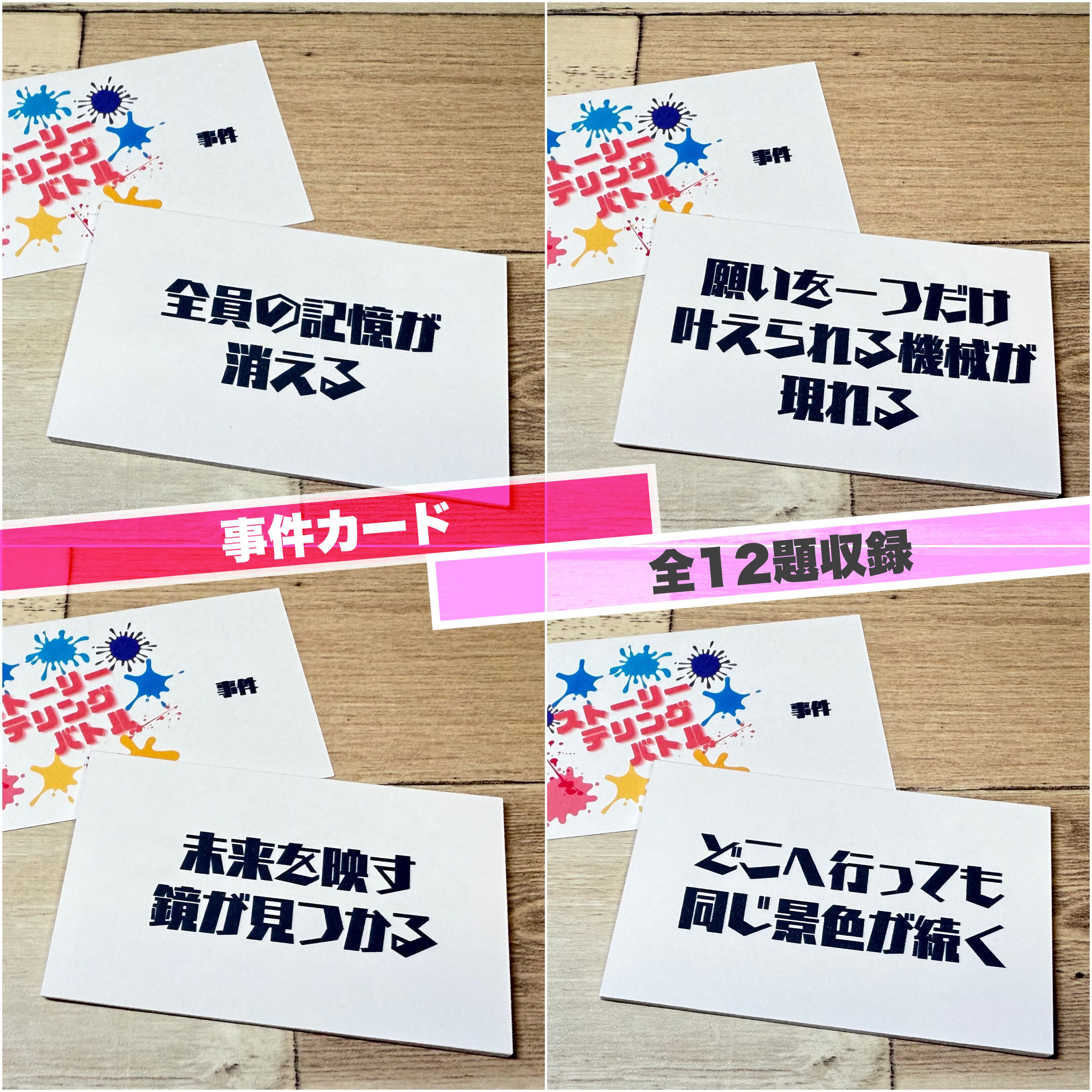 登場人物や舞台、事件などをカードで引き、その場で物語を即興で作るカードゲームです。