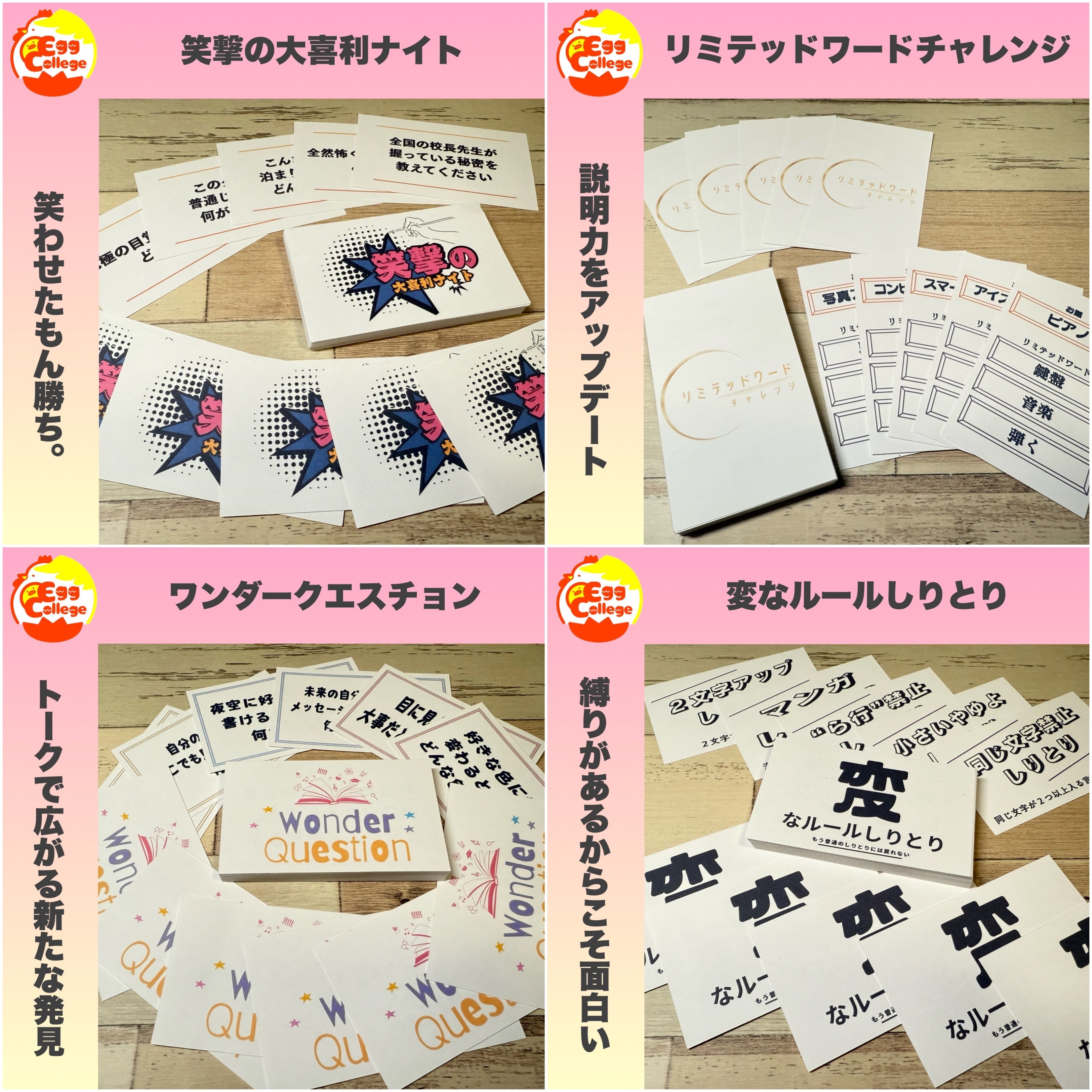 変わったルールのしりとりを楽しむカードゲームです。通常のしりとりに一風変わった条件が加わり、笑いや驚きが絶えません。
