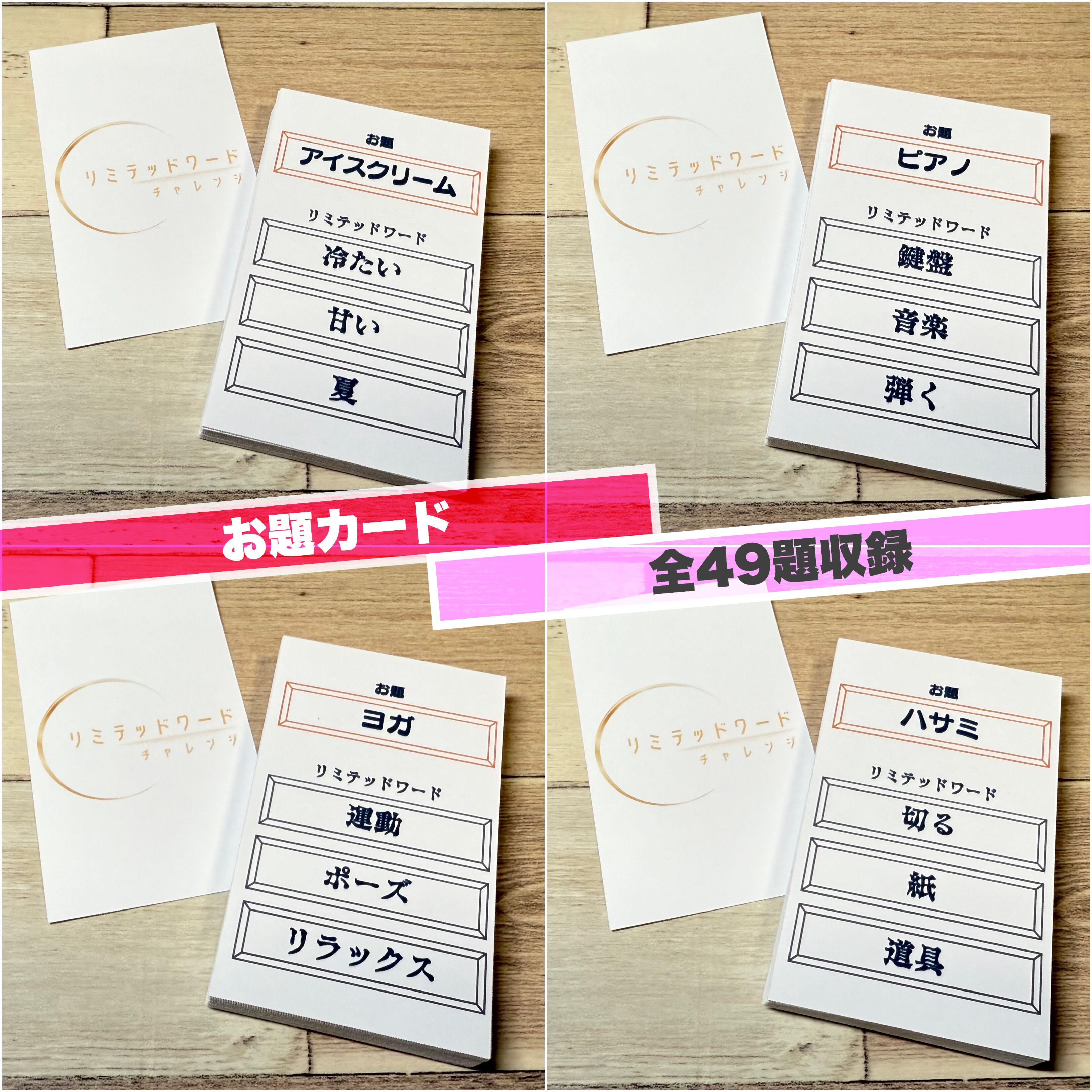 使えない単語「リミテッドワード」を避けながらお題を説明するゲームです。使える言葉に制約があることで、発想力や表現力が試されます。