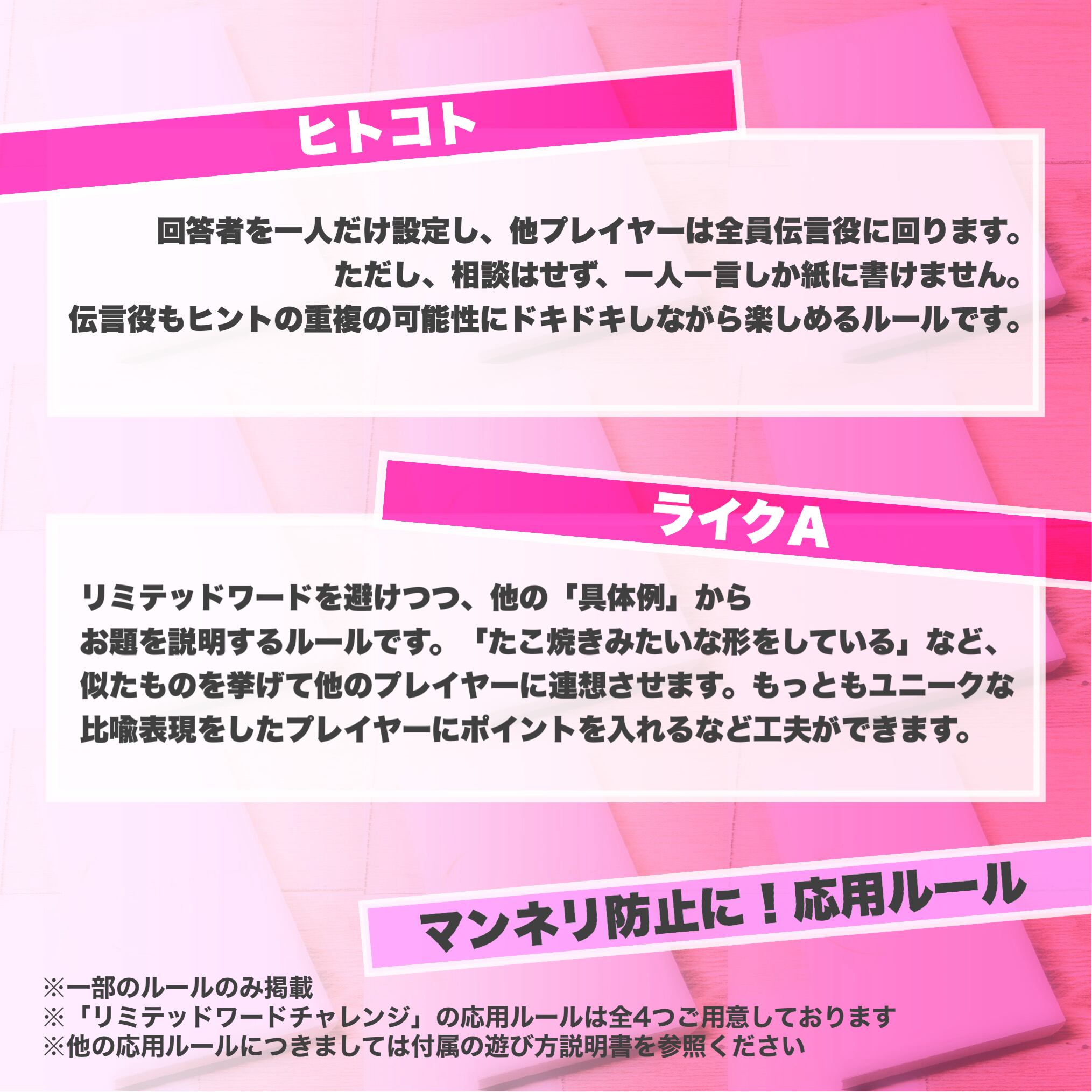 【リミテッドワードチャレンジ】ボードゲーム パーティー 友達 家族 論理的思考力 創造力 判断力 協調性 旅行 レクリエーション 保育園 小学生 中学生 高校生 大学生 リハビリ 介護 パズル