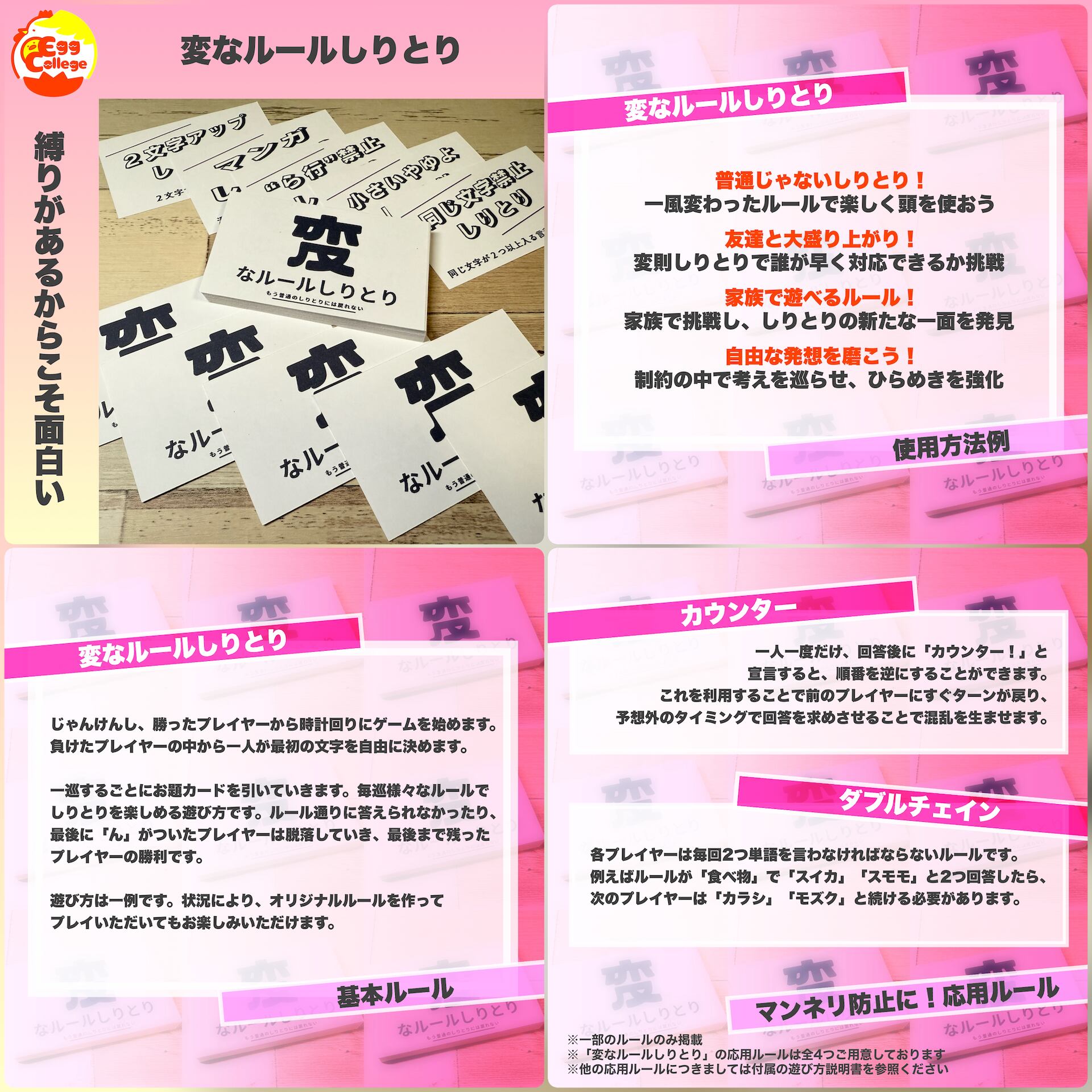 頭をひねりながら考えるユニークなルールが揃い、しりとりの新たな一面が楽しめます。