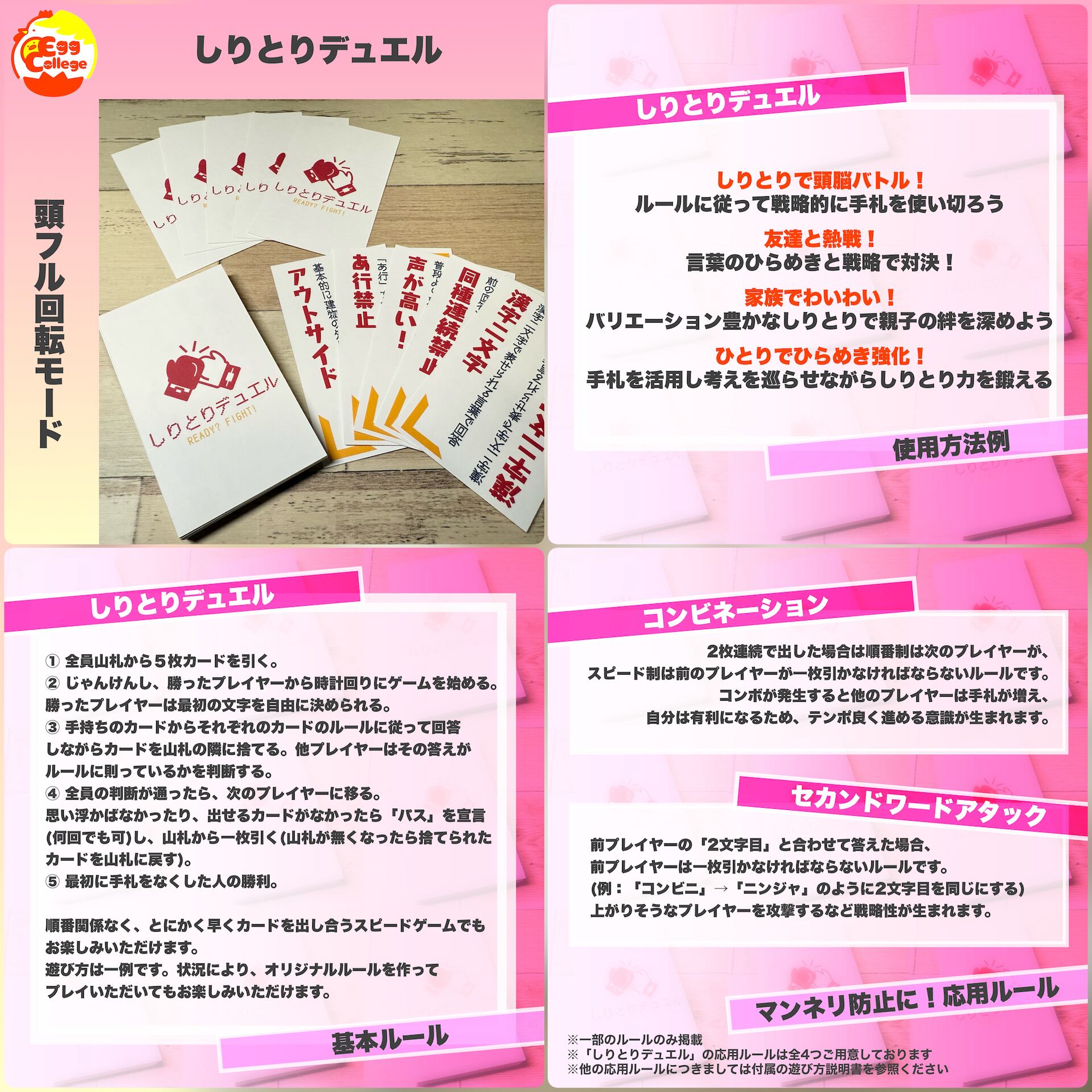 しりとりをベースにさまざまなルールが楽しめるカードゲームです。各プレイヤーはしりとりのカードを持ち、思いもよらないルールで勝利を目指します。