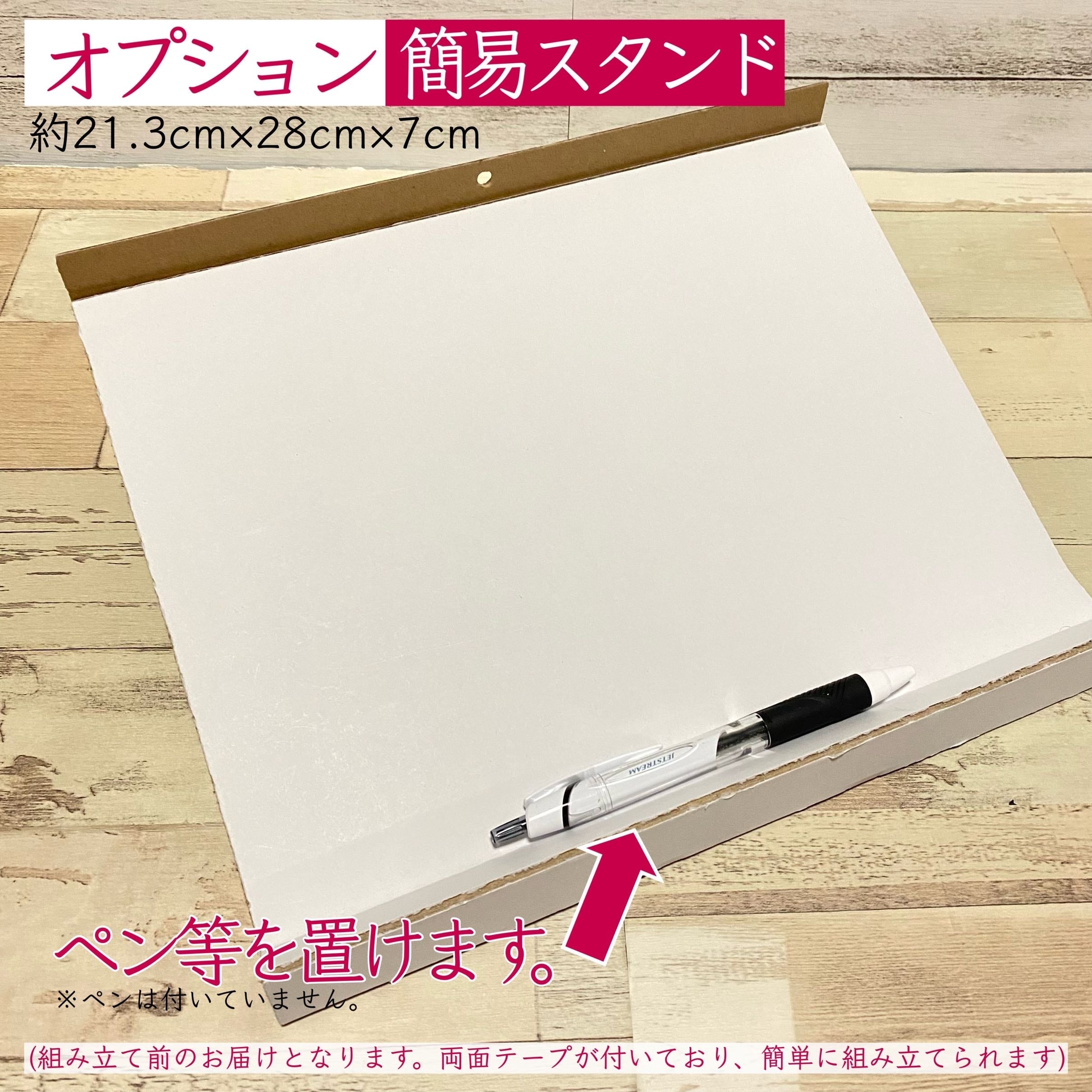 簡易スタンドは有料オプションです。画像は簡易スタンドを使用しての紹介となりますが、デフォルトは付属されておりませんので、ご希望時は必ずその旨ご連絡・オプション選択を忘れずにお願いします。