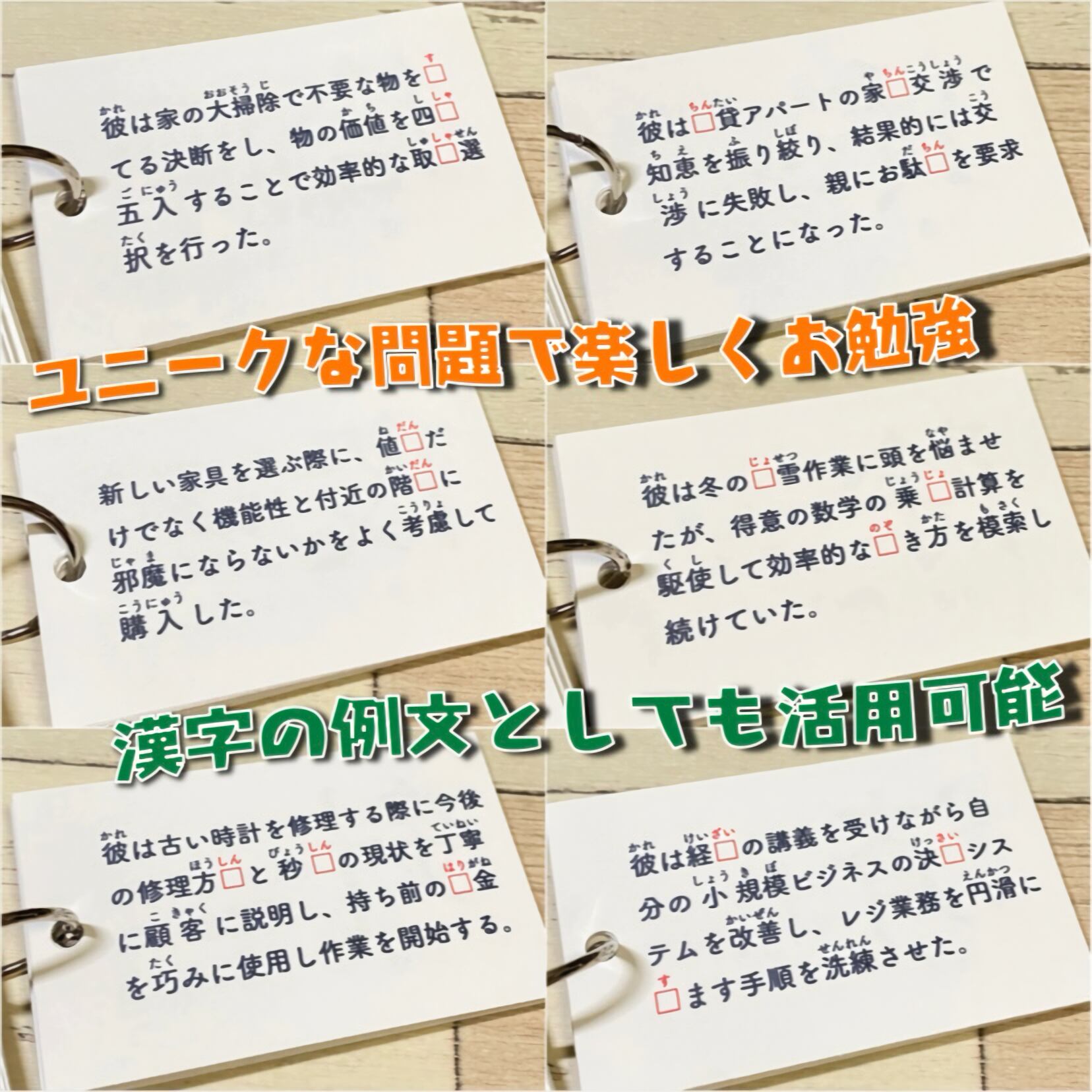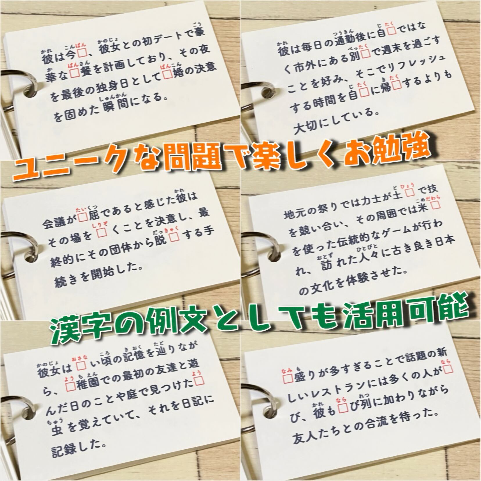 カードの文章は、表から進めると共通する漢字を埋める問題カードとして、裏から進めるとその漢字が用いられた例文カードとして使用することができます。