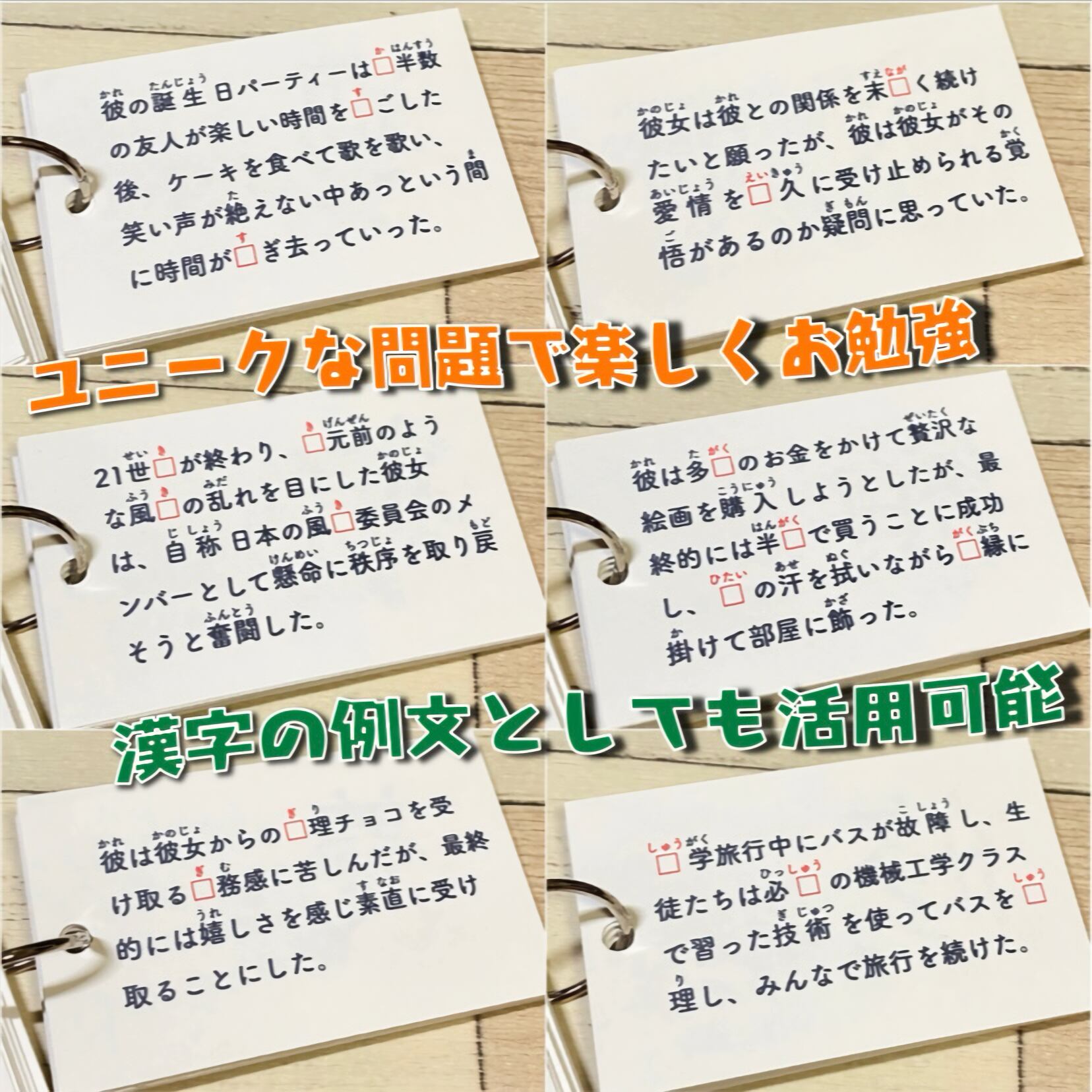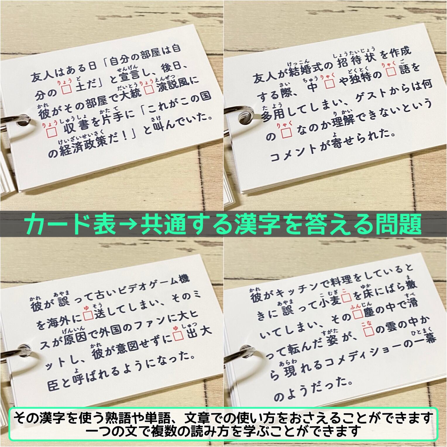 カードの文章は、表から進めると共通する漢字を埋める問題カードとして、裏から進めるとその漢字が用いられた例文カードとして使用することができます。