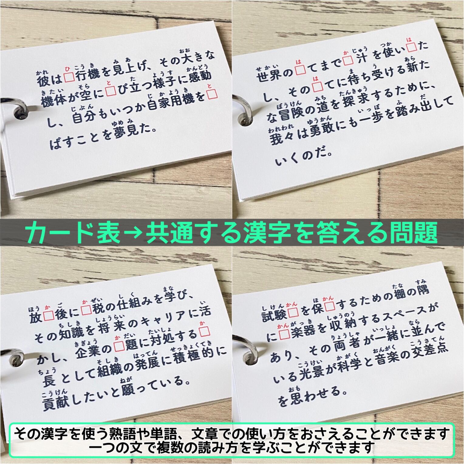 カードの文章は、表から進めると共通する漢字を埋める問題カードとして、裏から進めるとその漢字が用いられた例文カードとして使用することができます。