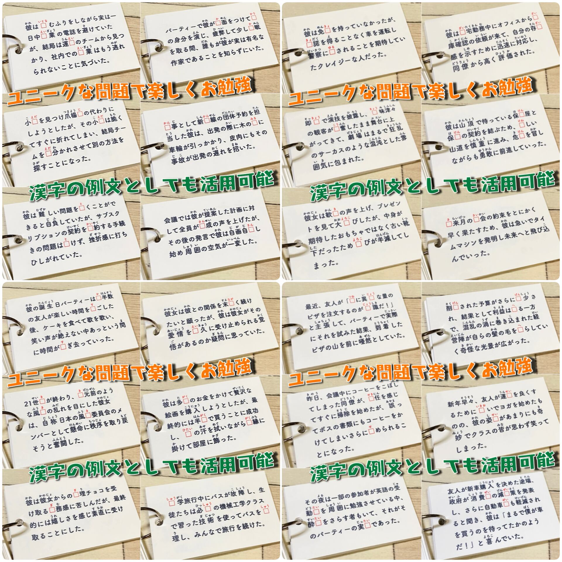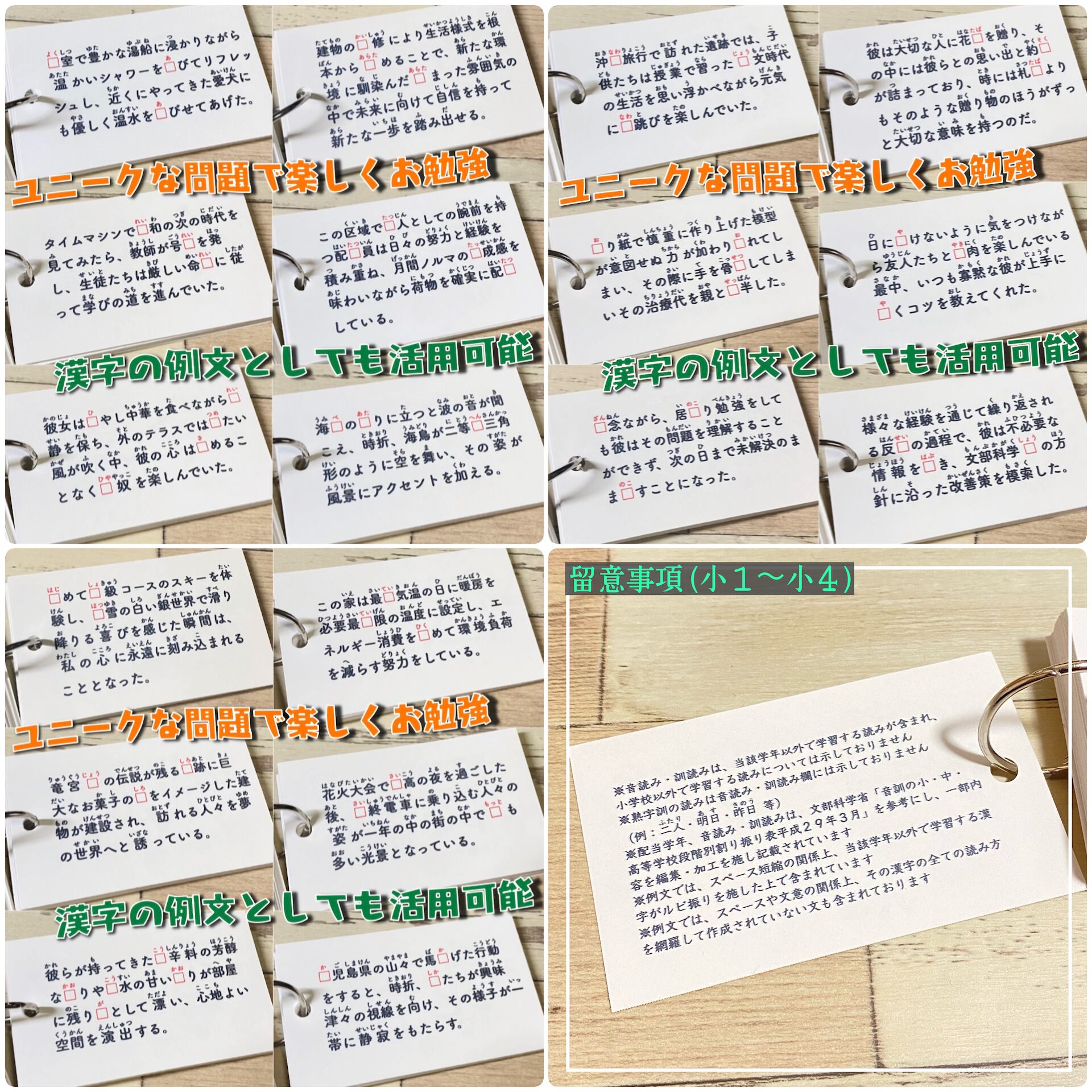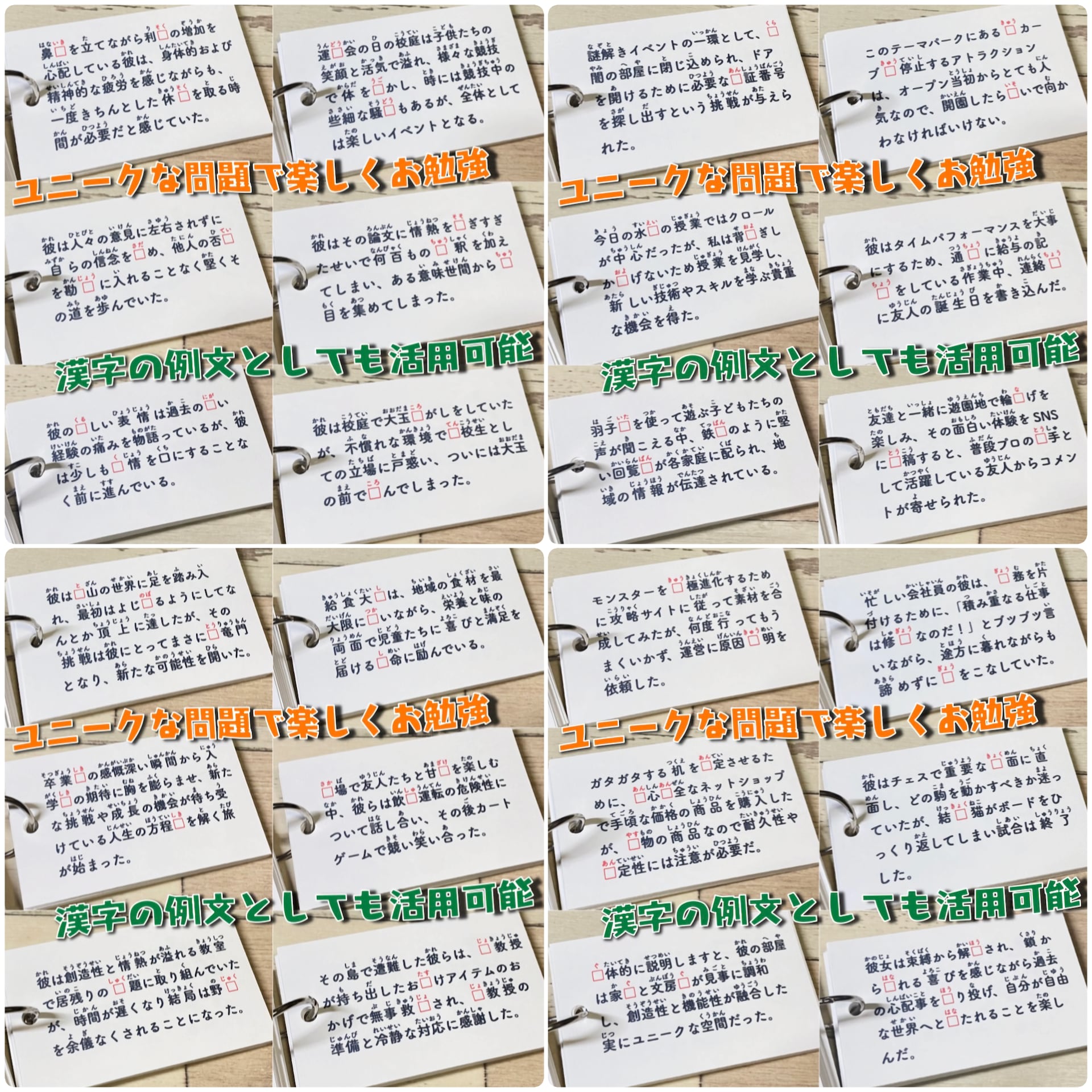 カードは表から進めると穴埋め問題、裏から進めると例文カードとして使えるため、書く力・読む力の両方を効果的に伸ばせます。