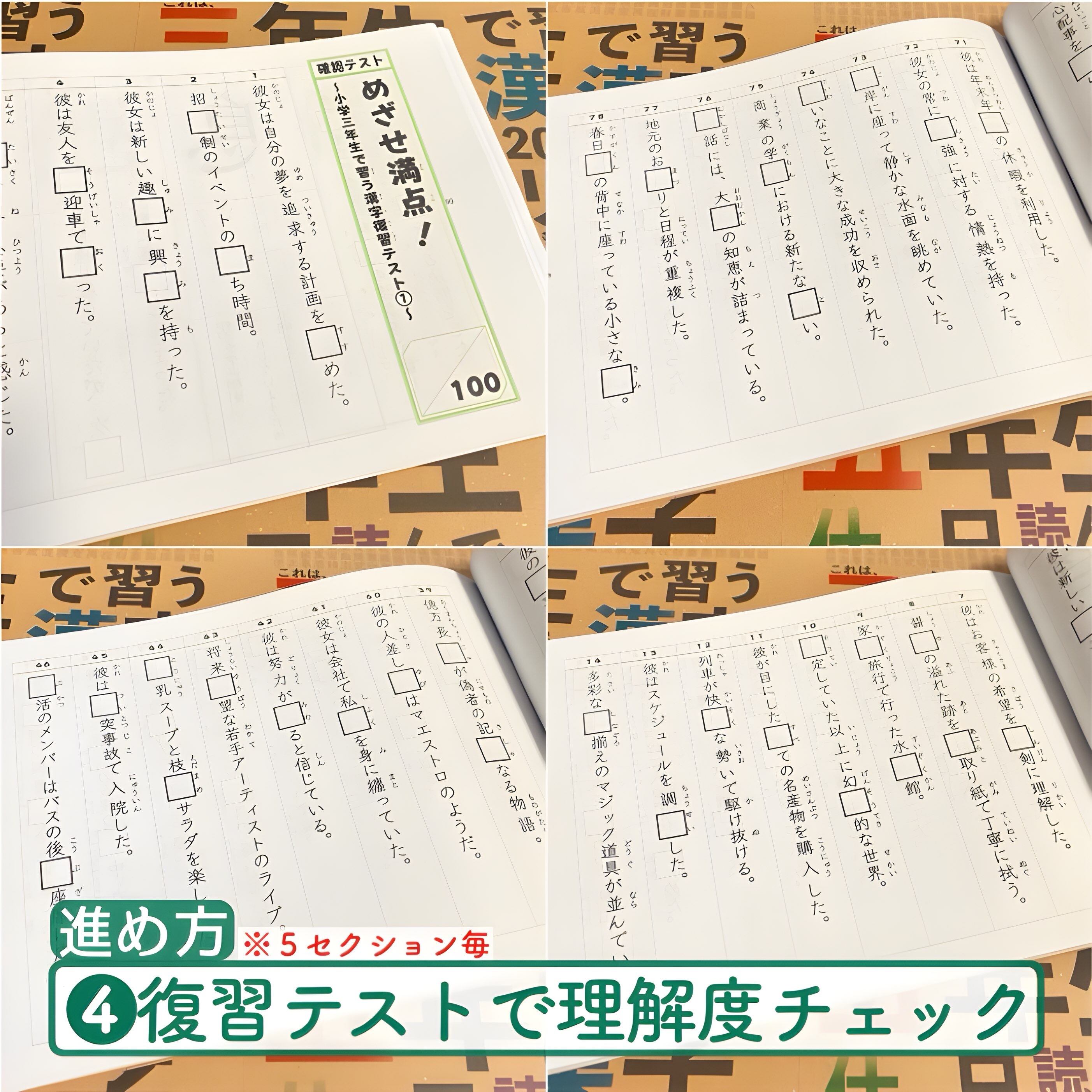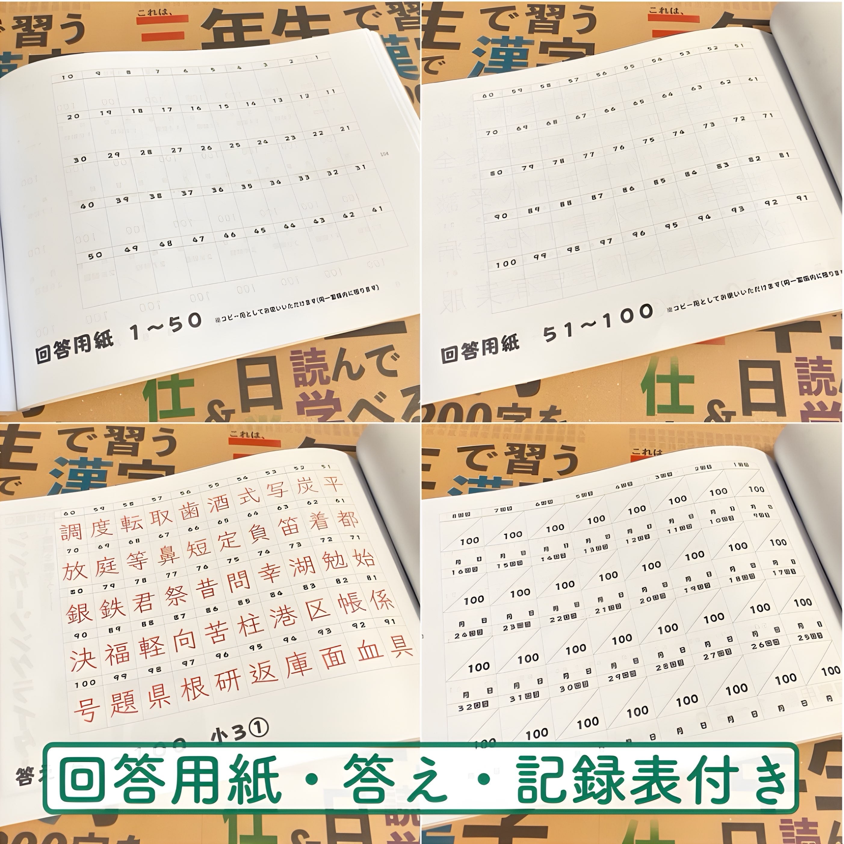 小学三年生〜六年生の漢字ドリルには、5セクション毎に復習テストを設け、理解度チェックを行うことができます。問題はシャッフルして出題、回答用紙&32回分使える記録表を付属しております。