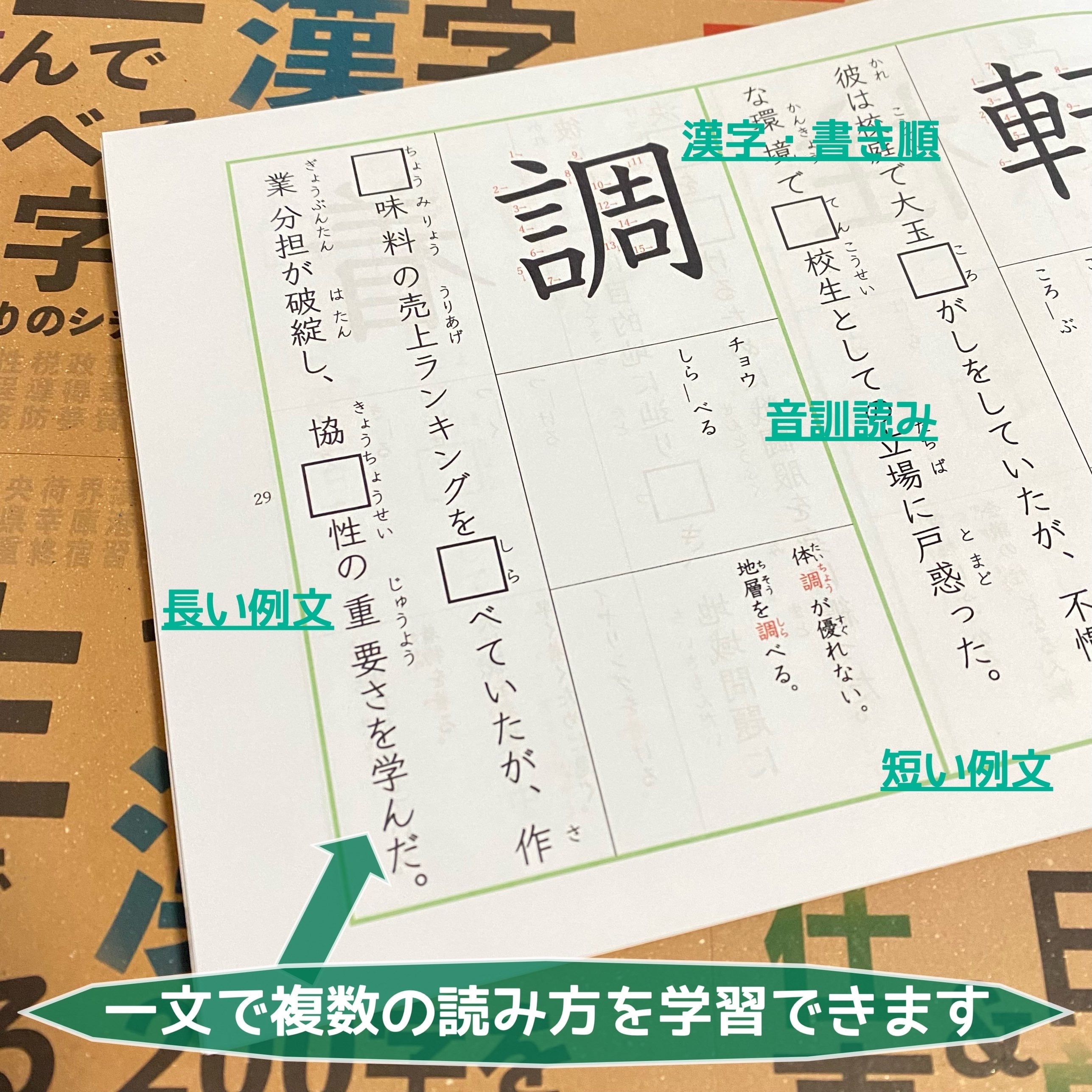 各漢字の音訓読み・その各例文と、一文の中で複数の読み方が使われているオリジナル例文で理解度を深められます。