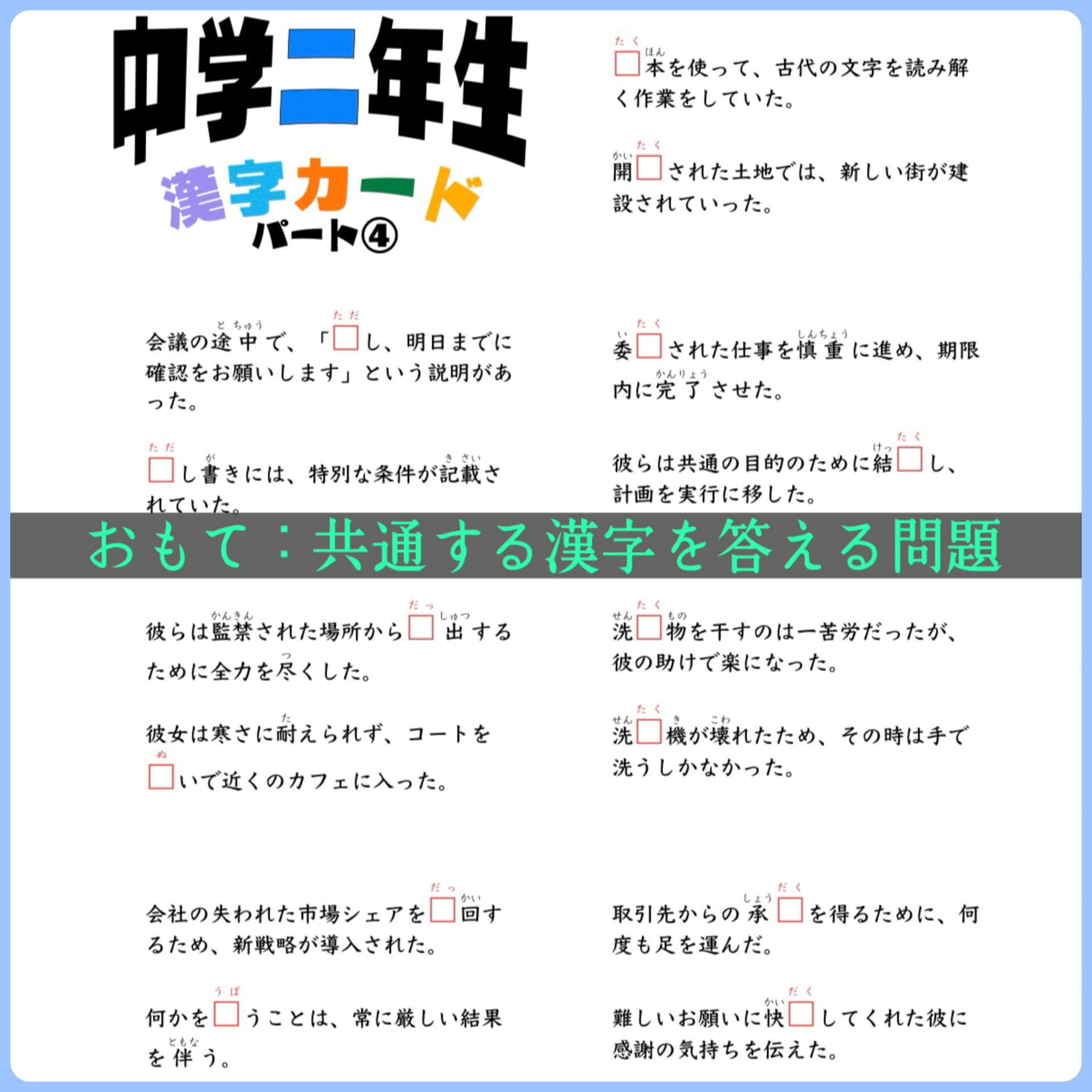 カードは、表から進めると共通する漢字を埋める問題カードとして、裏から進めるとその漢字を用いた例文カードとして使用可能。暗記・読解・文法の力をバランスよく身につけられる構成です。