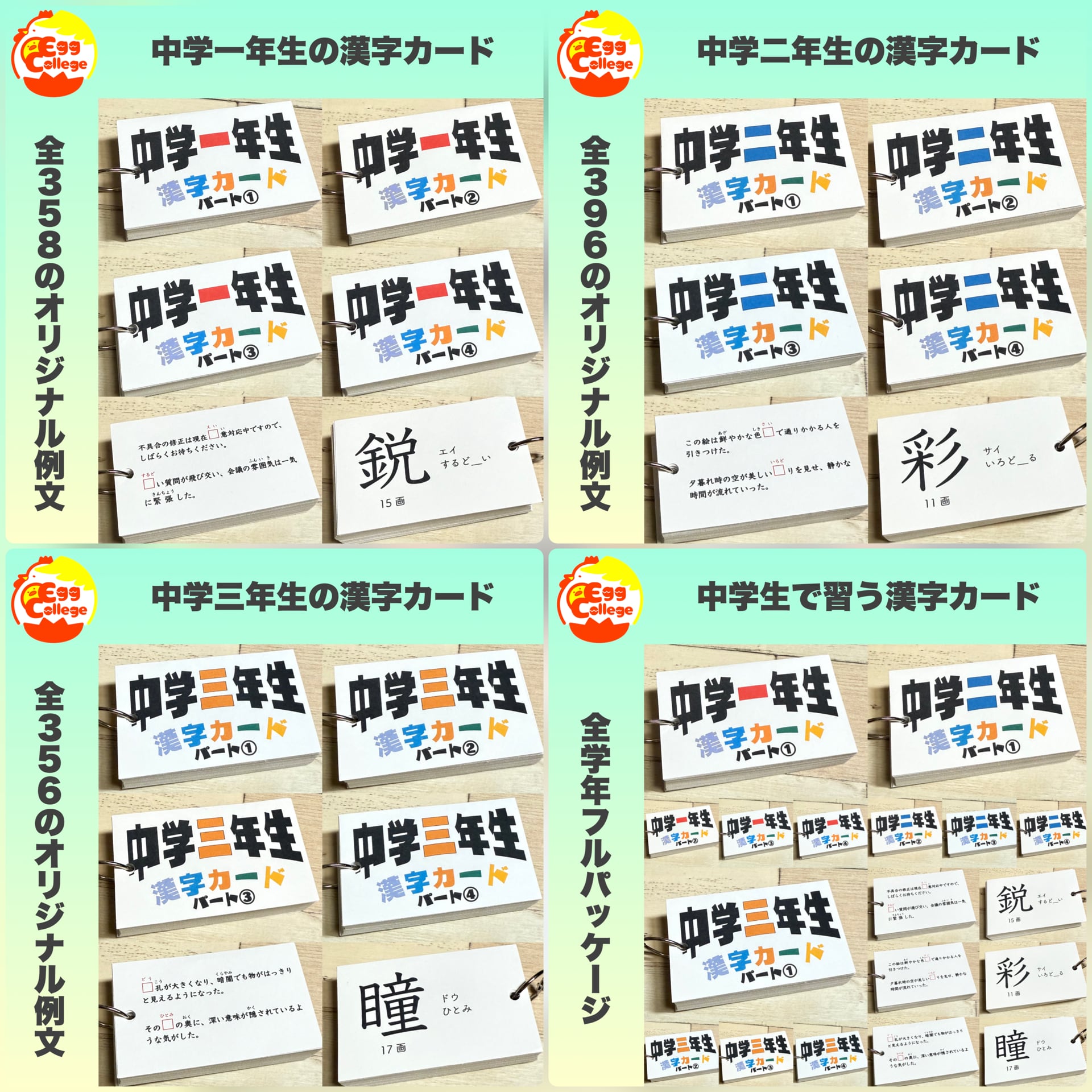 中学二年生で学ぶ漢字396字を収録した漢字カードです。