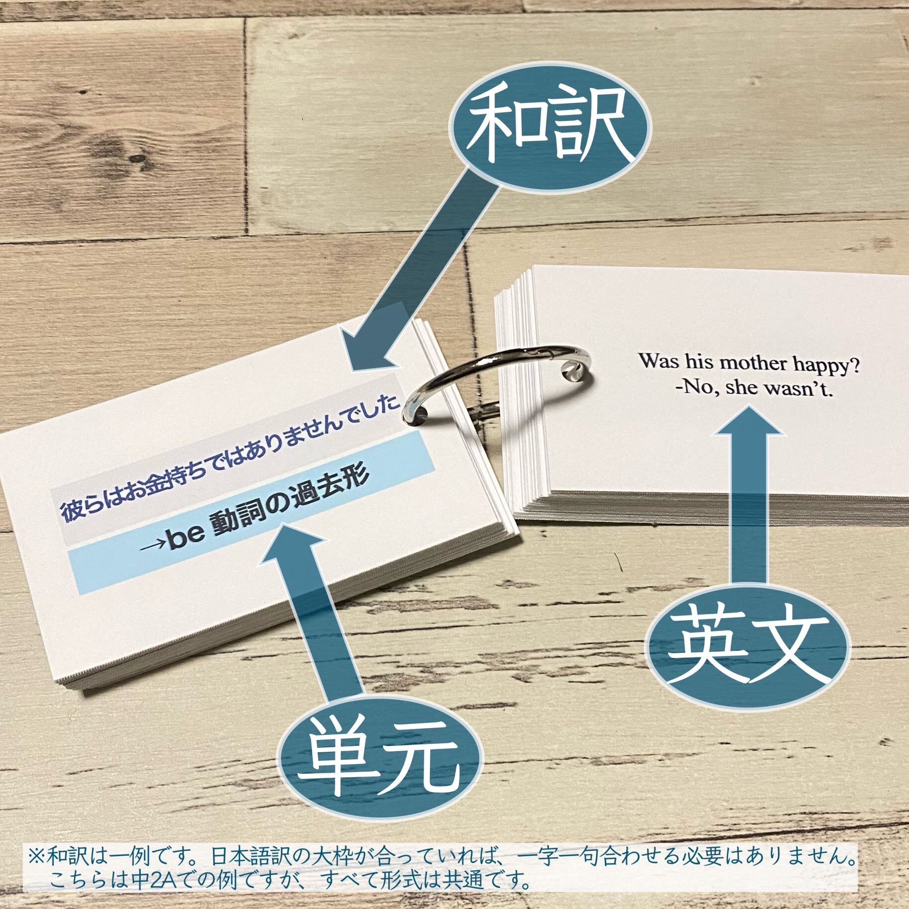 中学2年生で学習する英文法と、その範囲の和訳が瞬時にできるようになる能力を養える英語カードのセットです。