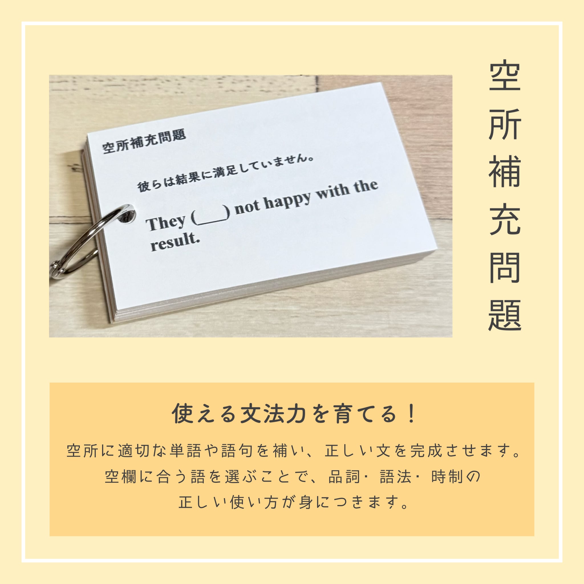 それぞれのカードには、該当文法の丁寧な解説と、整序・空所補充・和訳・正誤問題を合計40問以上収録。裏面には解答とともにSVOCM構造と詳しい解説があるため、文法知識に加えて、英文解釈・構文の見抜き方まで自然と身につくのが本商品の大きな特長です。