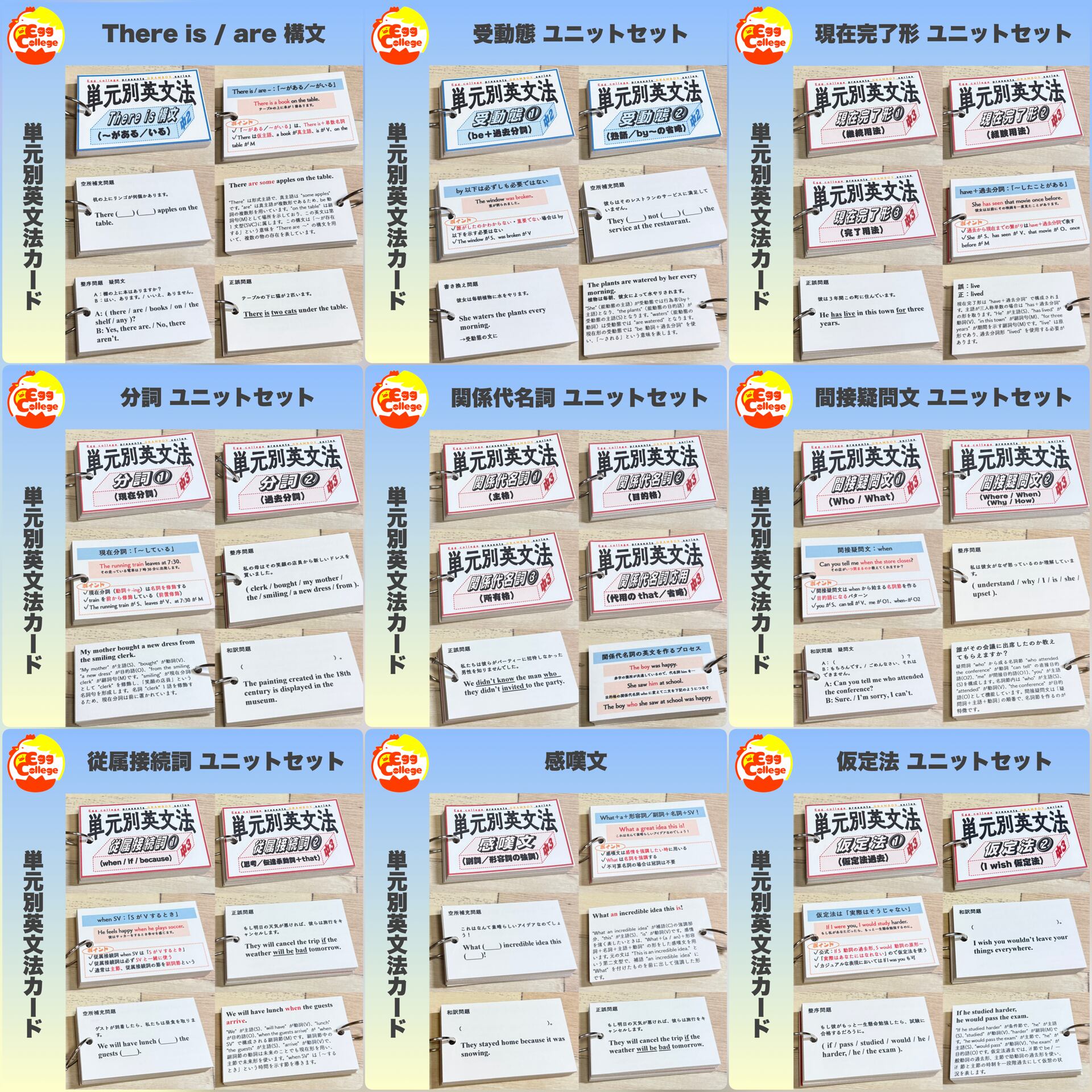 単元別英文法カードは、中学英文法を全64項目に細分化し、単元グループ別、テーマ別、学年別等ごとにお求めいただける学習カードです。