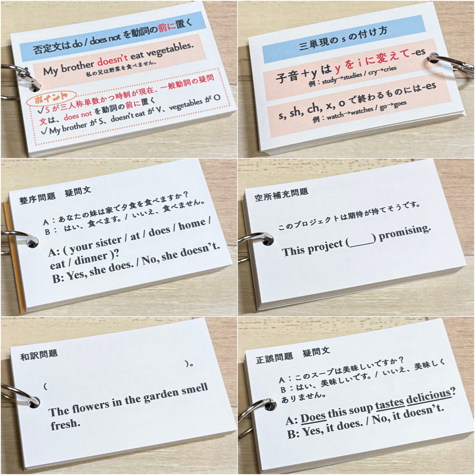 それぞれのカードには、該当文法の丁寧な解説と、整序・空所補充・和訳・正誤問題を合計40問以上収録。裏面には解答とともにSVOCM構造と詳しい解説があるため、文法知識に加えて、英文解釈・構文の見抜き方まで自然と身につくのが本商品の大きな特長です。