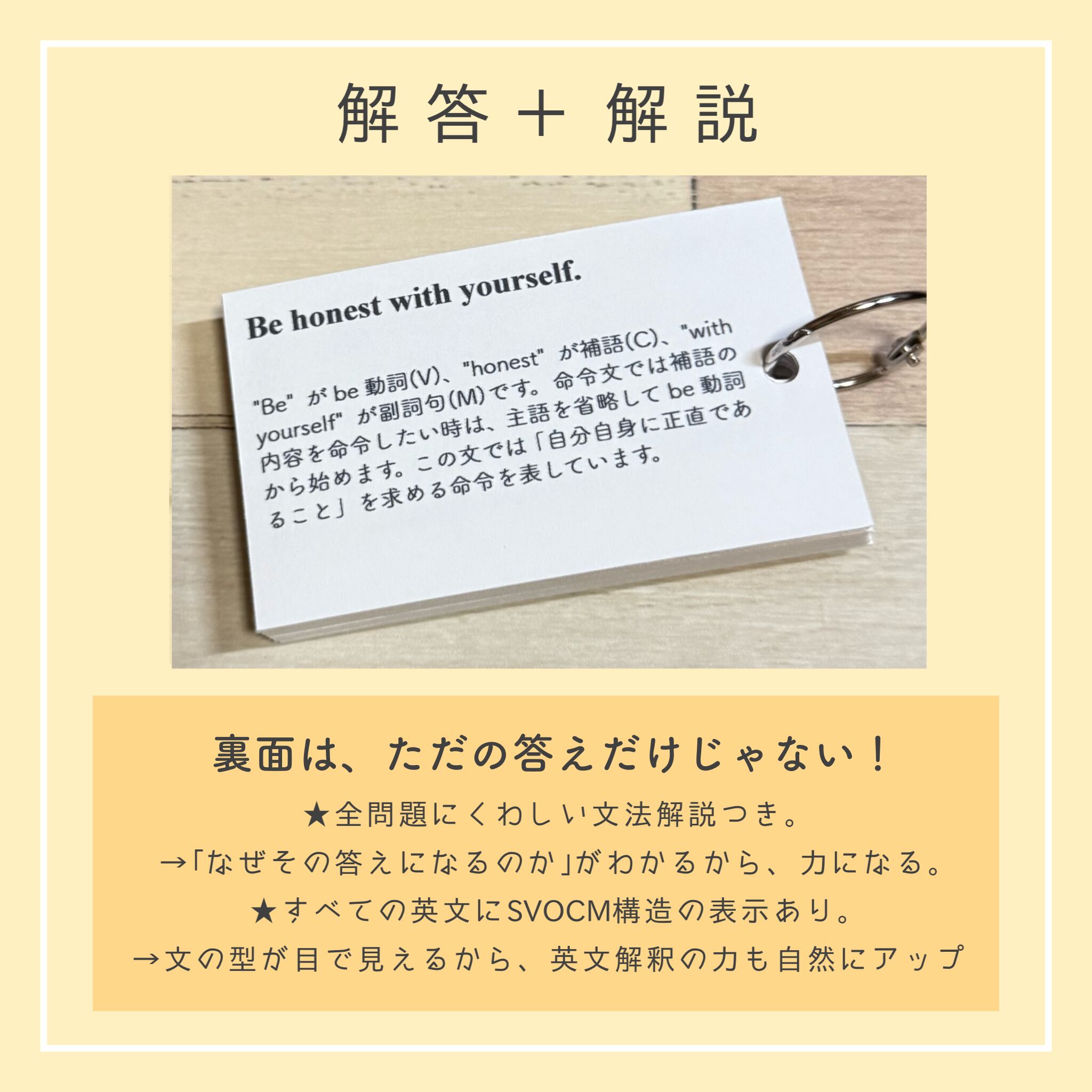 それぞれのカードには、該当文法の丁寧な解説と、整序・空所補充・和訳・正誤問題を合計40問以上収録。裏面には解答とともにSVOCM構造と詳しい解説があるため、文法知識に加えて、英文解釈・構文の見抜き方まで自然と身につくのが本商品の大きな特長です。