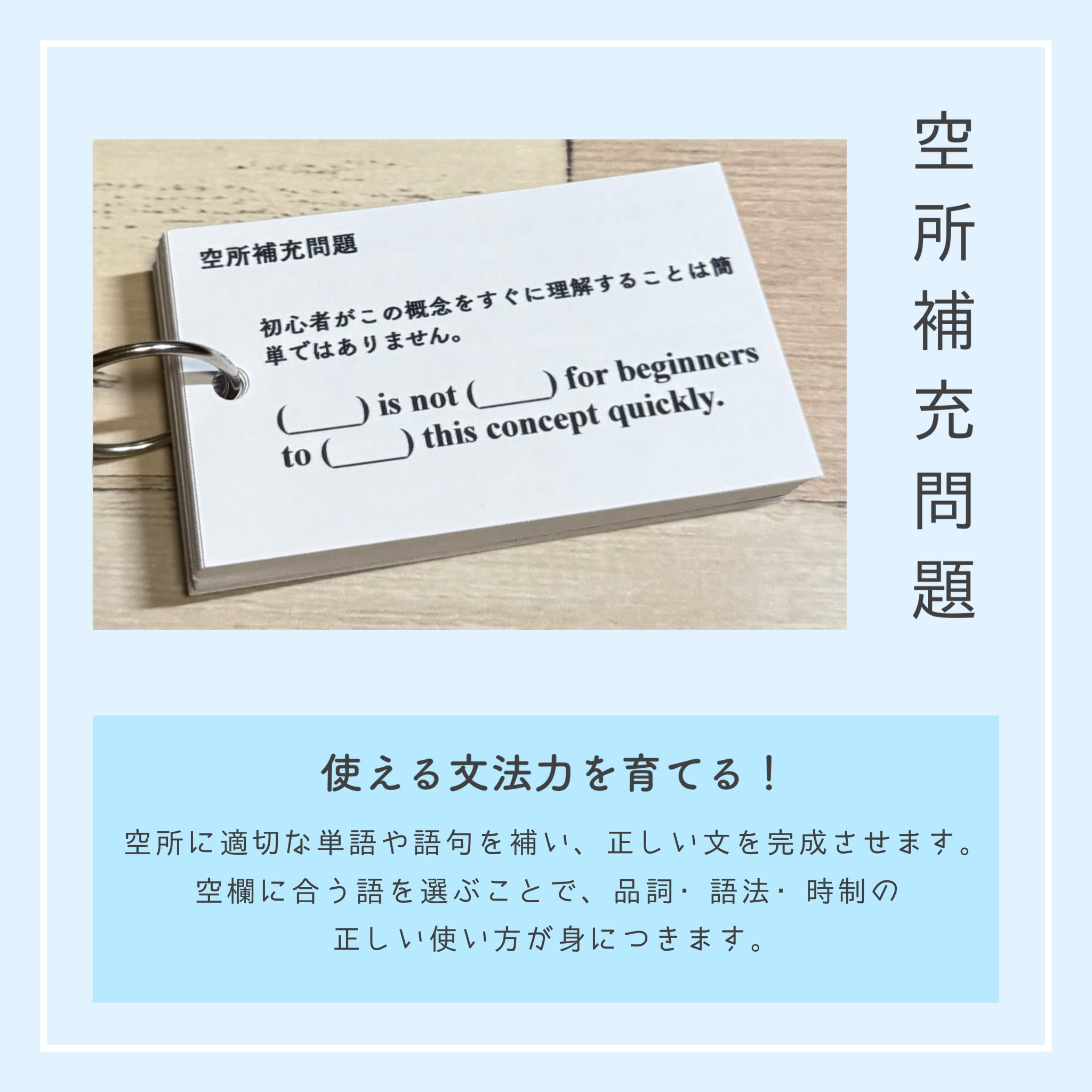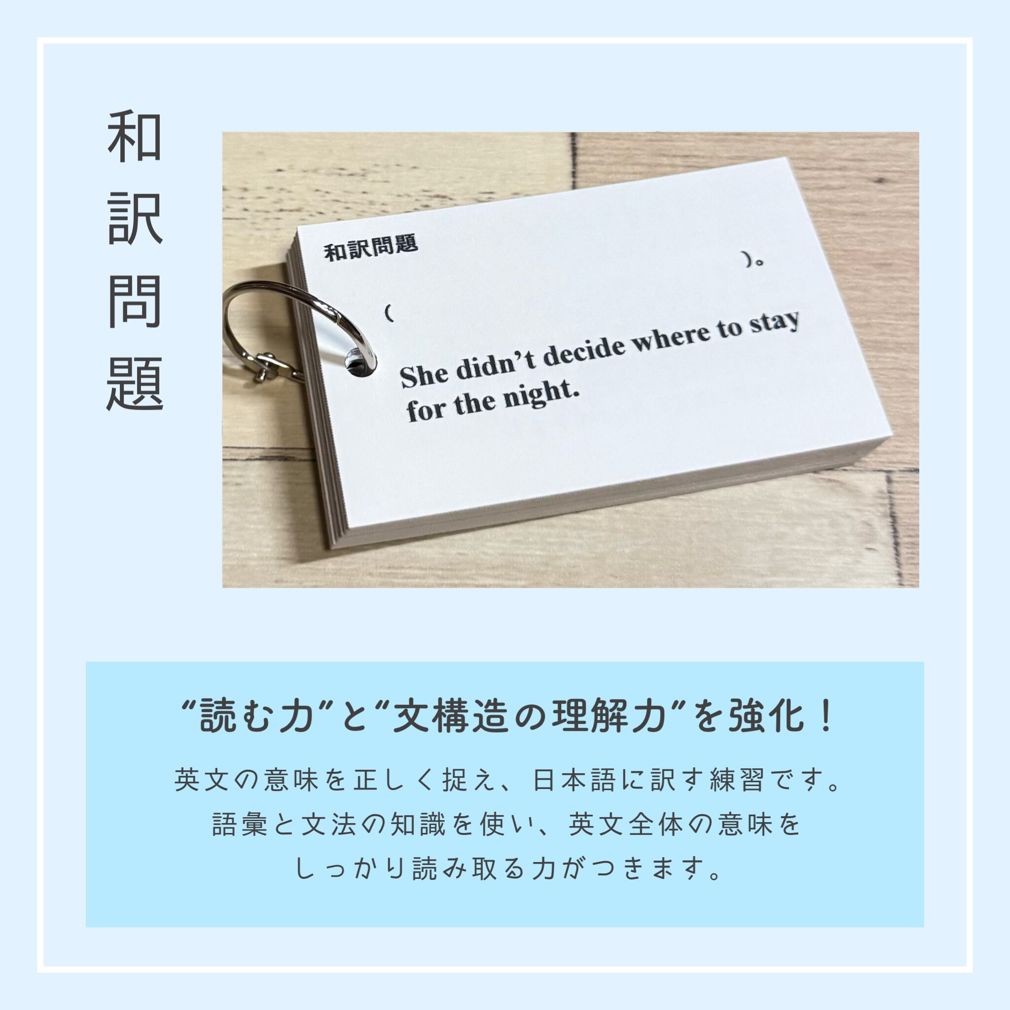 それぞれのカードには、該当文法の丁寧な解説と、整序・空所補充・和訳・正誤問題を合計40問以上収録。裏面には解答とともにSVOCM構造と詳しい解説があるため、文法知識に加えて、英文解釈・構文の見抜き方まで自然と身につくのが本商品の大きな特長です。