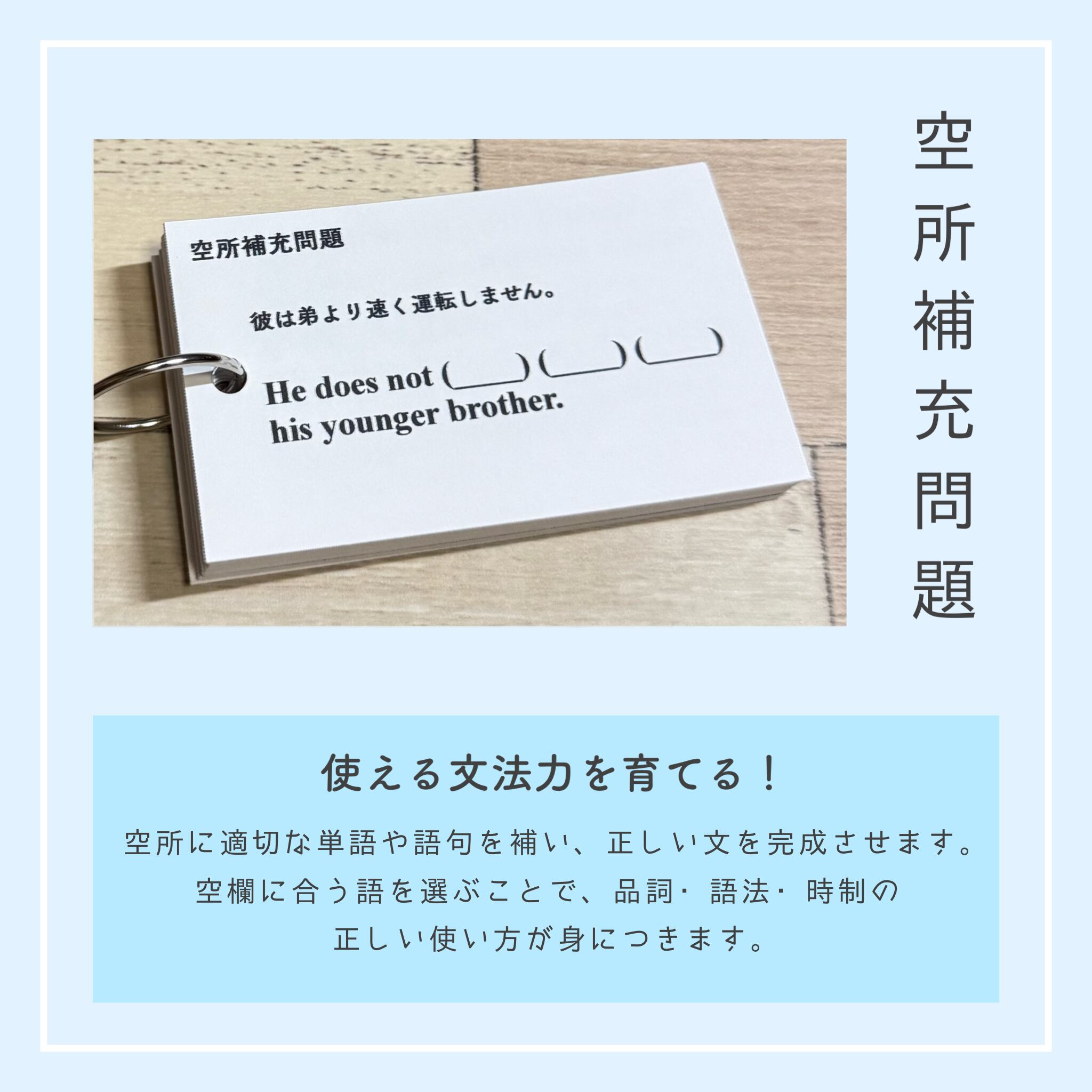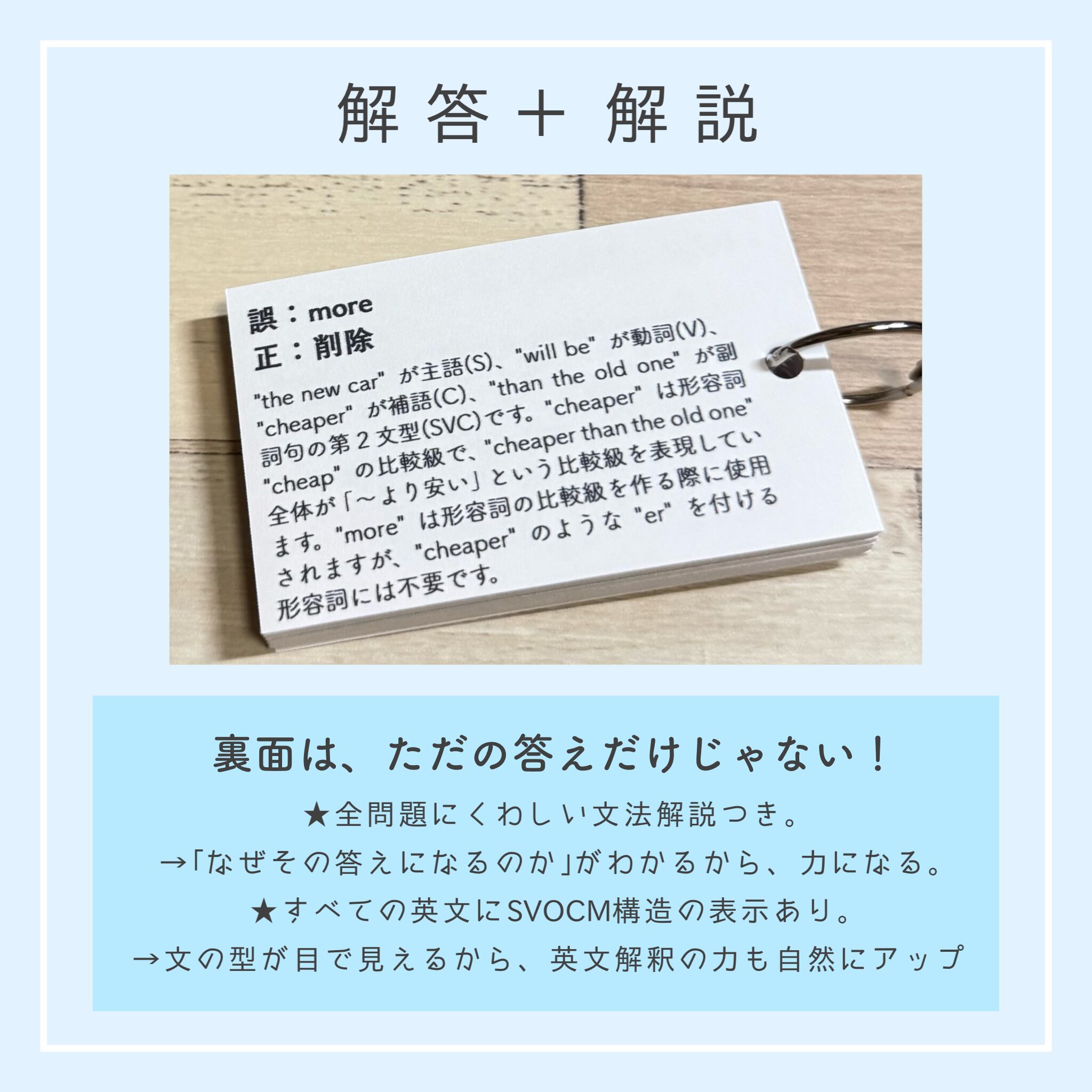 それぞれのカードには、該当文法の丁寧な解説と、整序・空所補充・和訳・正誤問題を合計40問以上収録。裏面には解答とともにSVOCM構造と詳しい解説があるため、文法知識に加えて、英文解釈・構文の見抜き方まで自然と身につくのが本商品の大きな特長です。