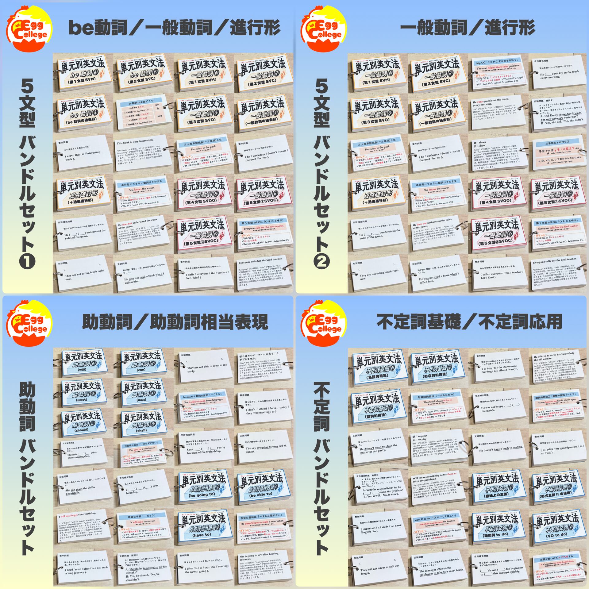 単元別英文法カードは、中学英文法を全64項目に細分化し、単元グループ別、テーマ別、学年別等ごとにお求めいただける学習カードです。