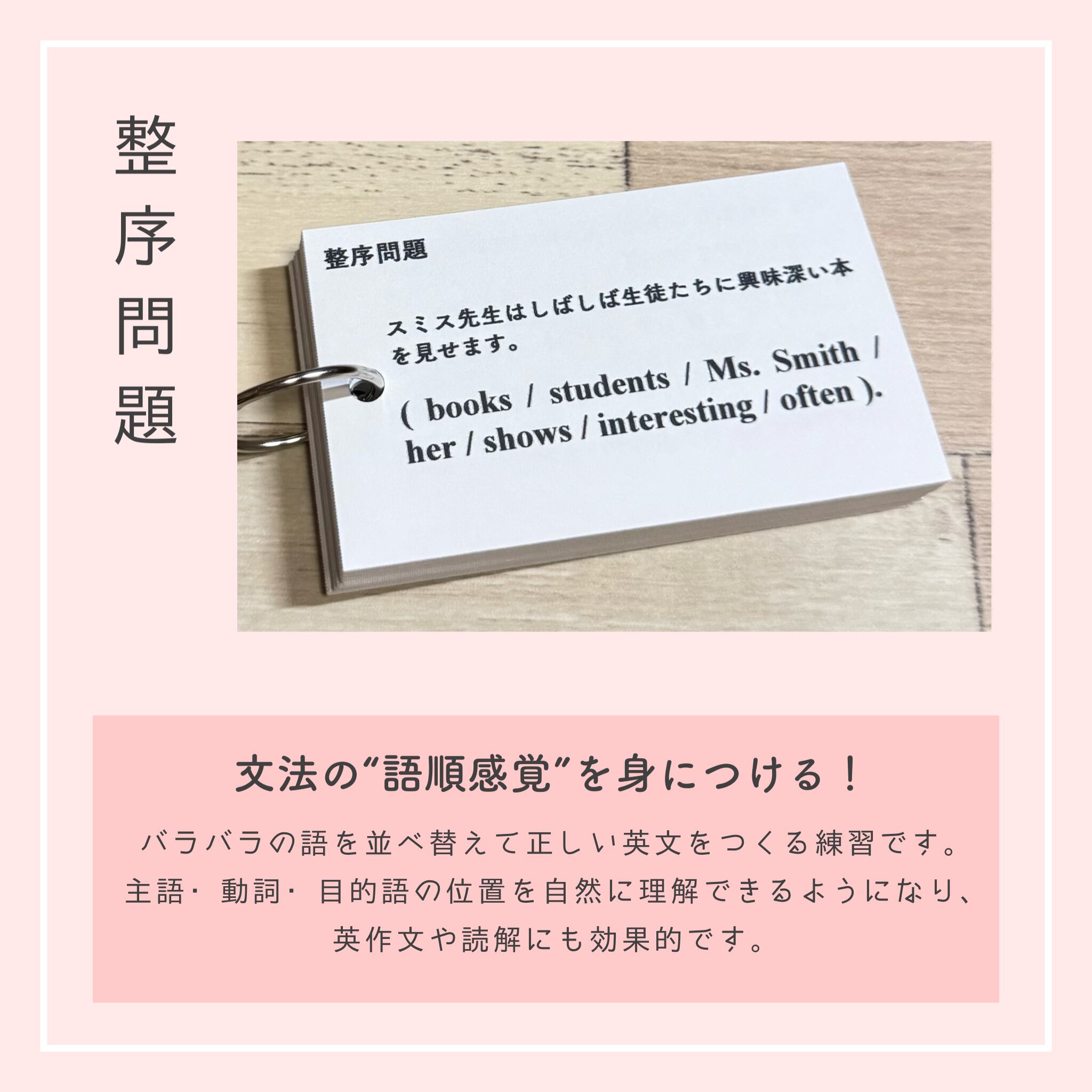 それぞれのカードには、該当文法の丁寧な解説と、整序・空所補充・和訳・正誤問題を合計40問以上収録。裏面には解答とともにSVOCM構造と詳しい解説があるため、文法知識に加えて、英文解釈・構文の見抜き方まで自然と身につくのが本商品の大きな特長です。