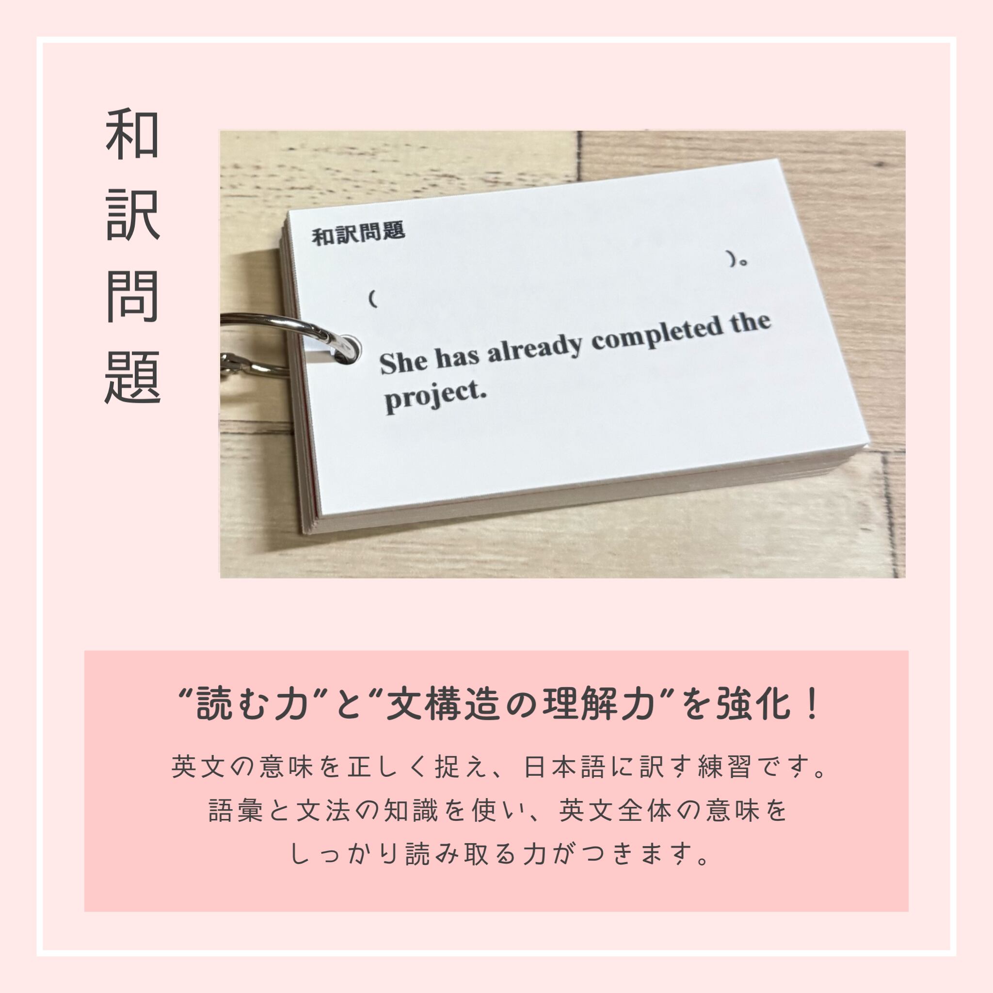 それぞれのカードには、該当文法の丁寧な解説と、整序・空所補充・和訳・正誤問題を合計40問以上収録。裏面には解答とともにSVOCM構造と詳しい解説があるため、文法知識に加えて、英文解釈・構文の見抜き方まで自然と身につくのが本商品の大きな特長です。