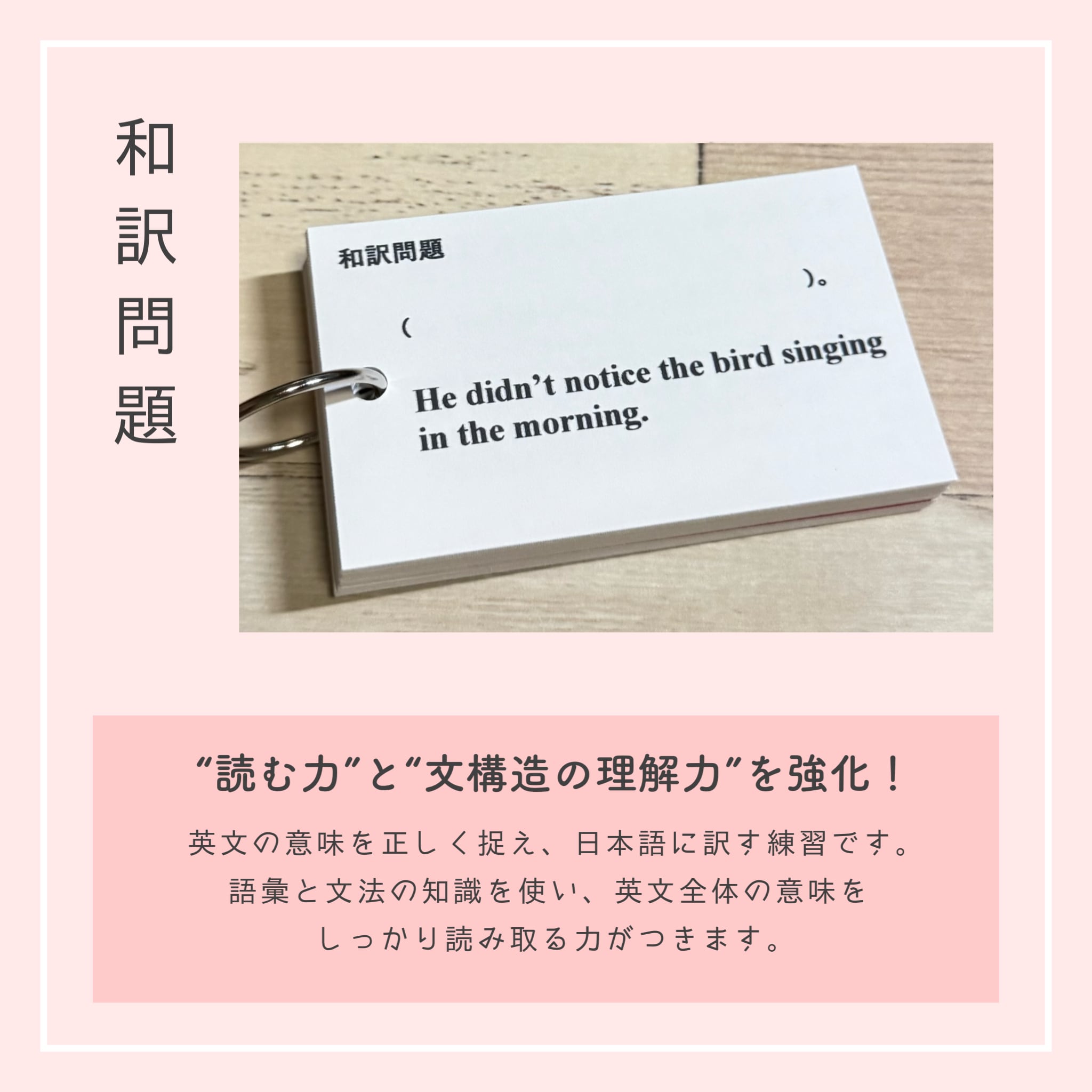 それぞれのカードには、該当文法の丁寧な解説と、整序・空所補充・和訳・正誤問題を合計40問以上収録。裏面には解答とともにSVOCM構造と詳しい解説があるため、文法知識に加えて、英文解釈・構文の見抜き方まで自然と身につくのが本商品の大きな特長です。