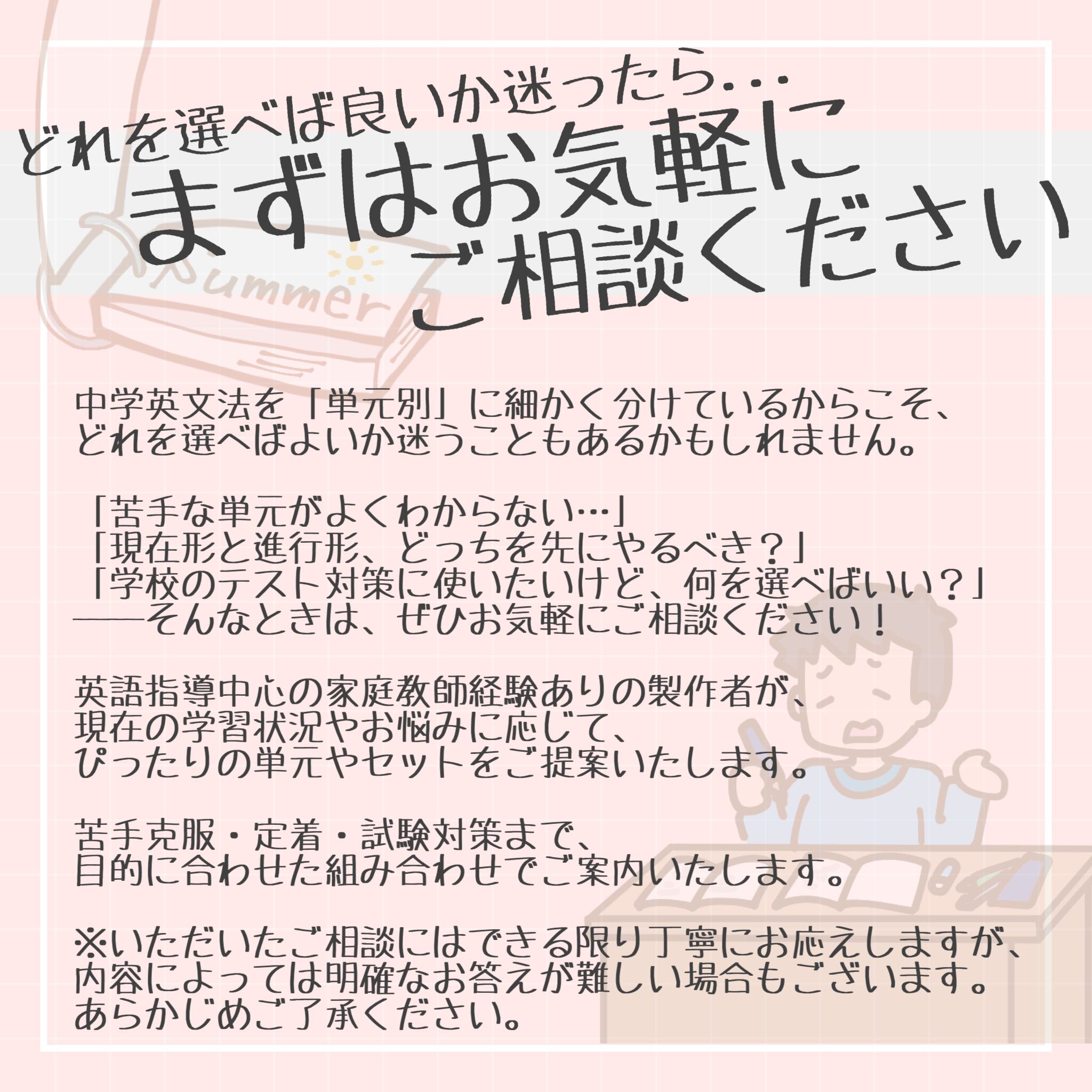 家庭教師として中学生の英語指導に携わった経験をもとに、「わかりやすく」「くり返しやすい」教材づくりを目指しています。