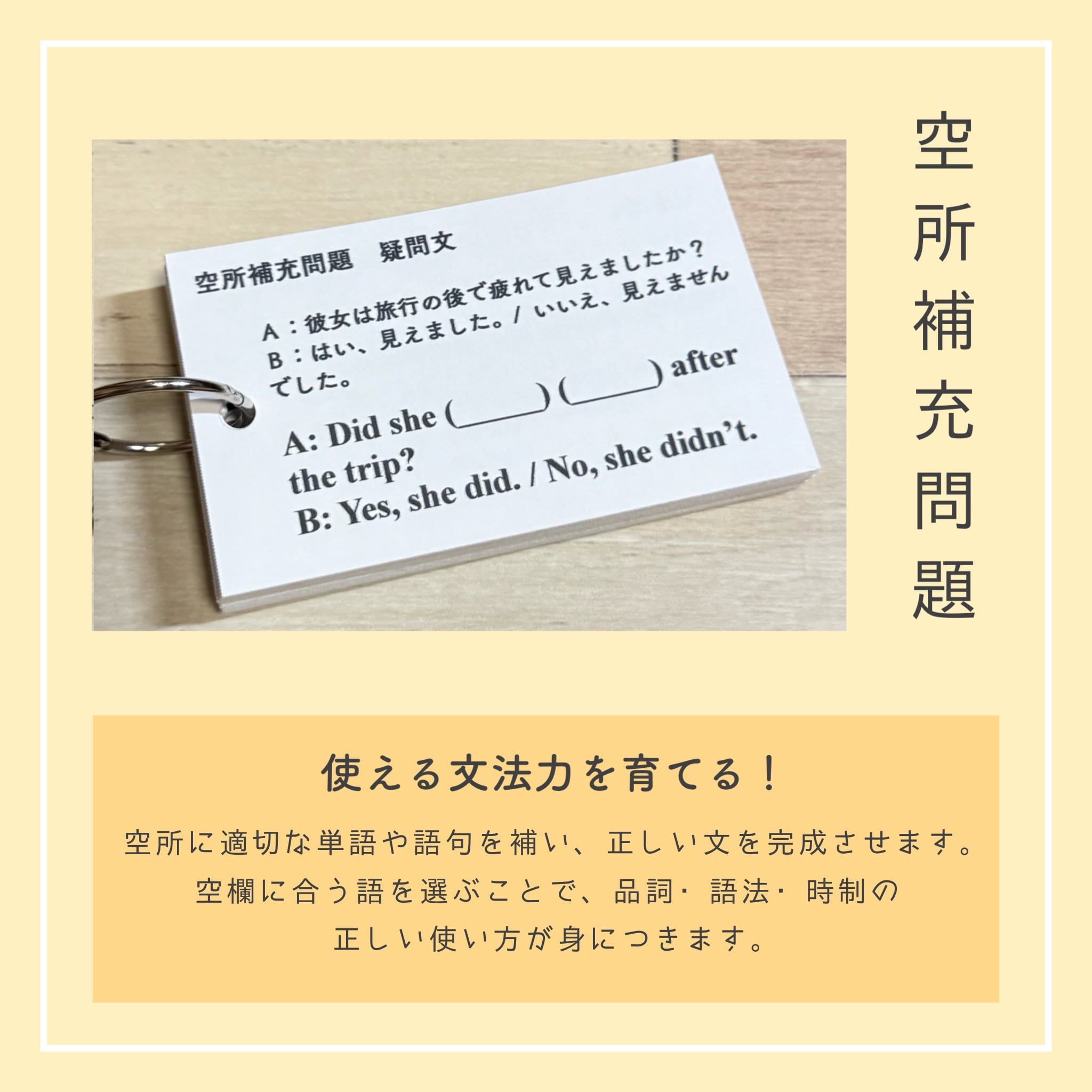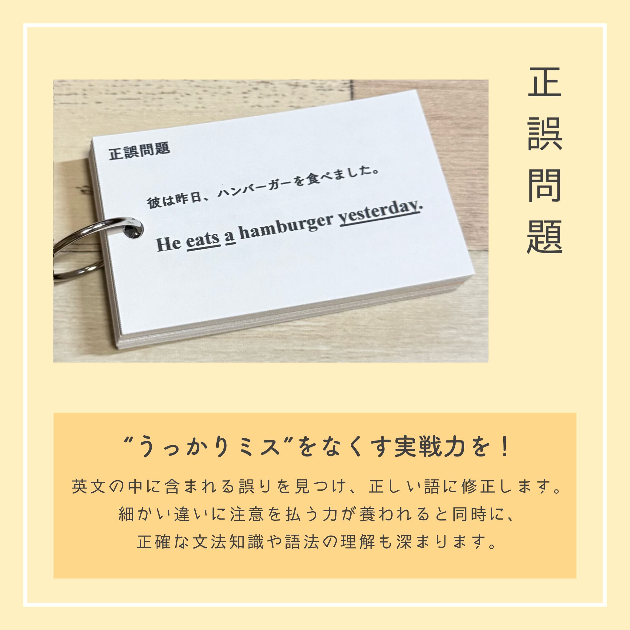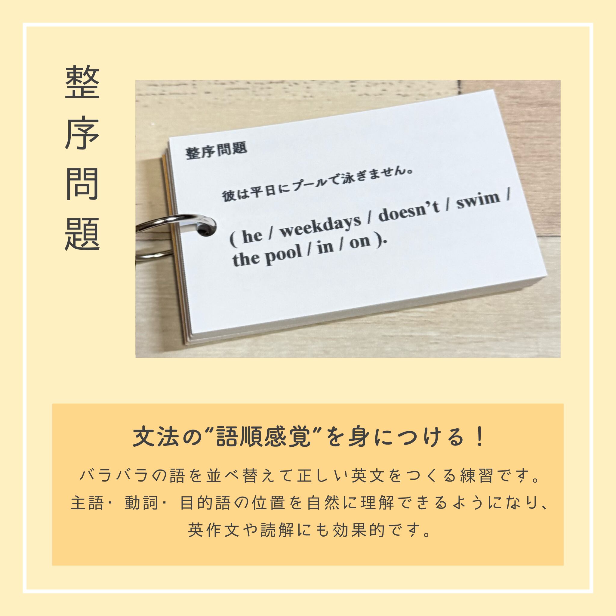 それぞれのカードには、該当文法の丁寧な解説と、整序・空所補充・和訳・正誤問題を合計40問以上収録。裏面には解答とともにSVOCM構造と詳しい解説があるため、文法知識に加えて、英文解釈・構文の見抜き方まで自然と身につくのが本商品の大きな特長です。