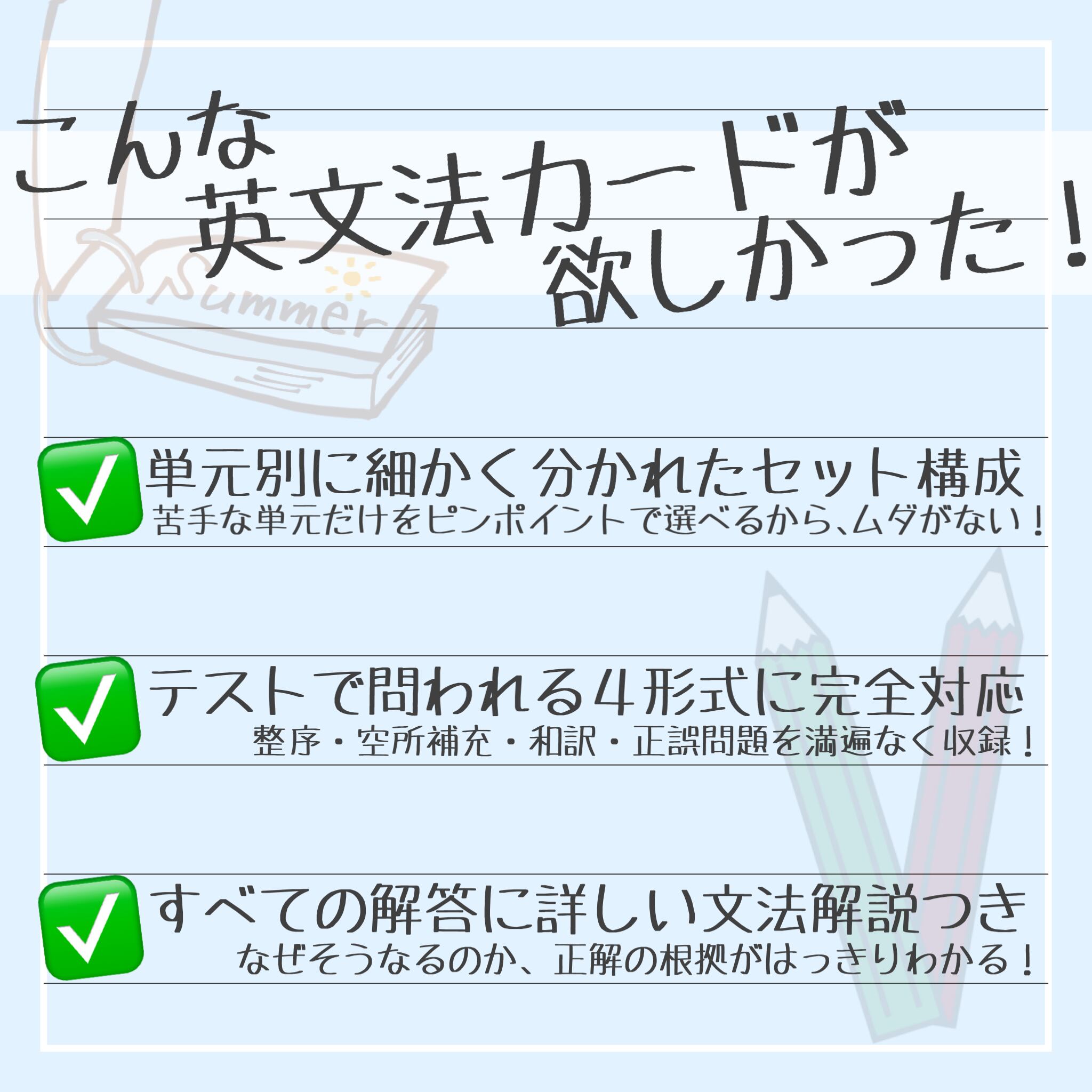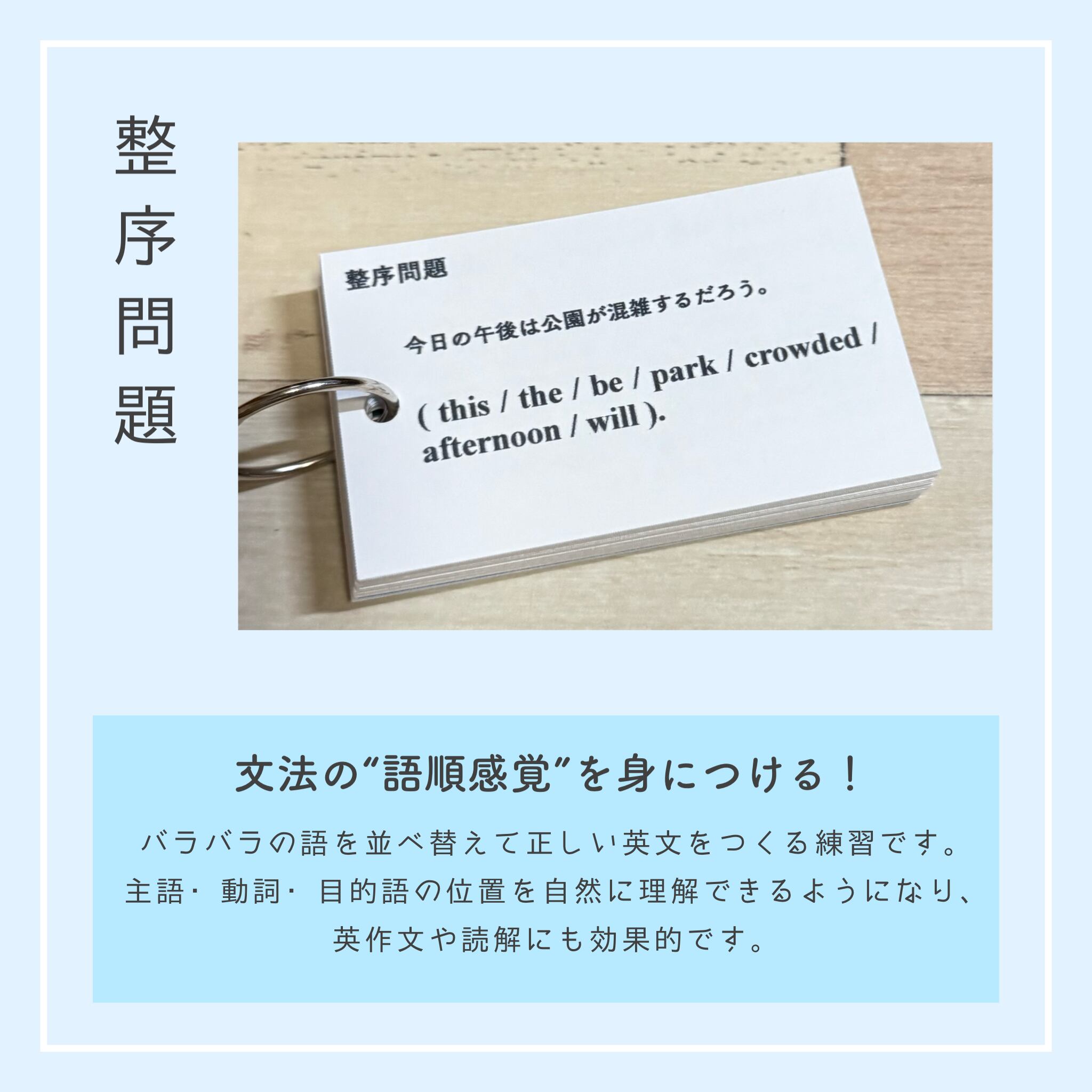 それぞれのカードには、該当文法の丁寧な解説と、整序・空所補充・和訳・正誤問題を合計40問以上収録。裏面には解答とともにSVOCM構造と詳しい解説があるため、文法知識に加えて、英文解釈・構文の見抜き方まで自然と身につくのが本商品の大きな特長です。