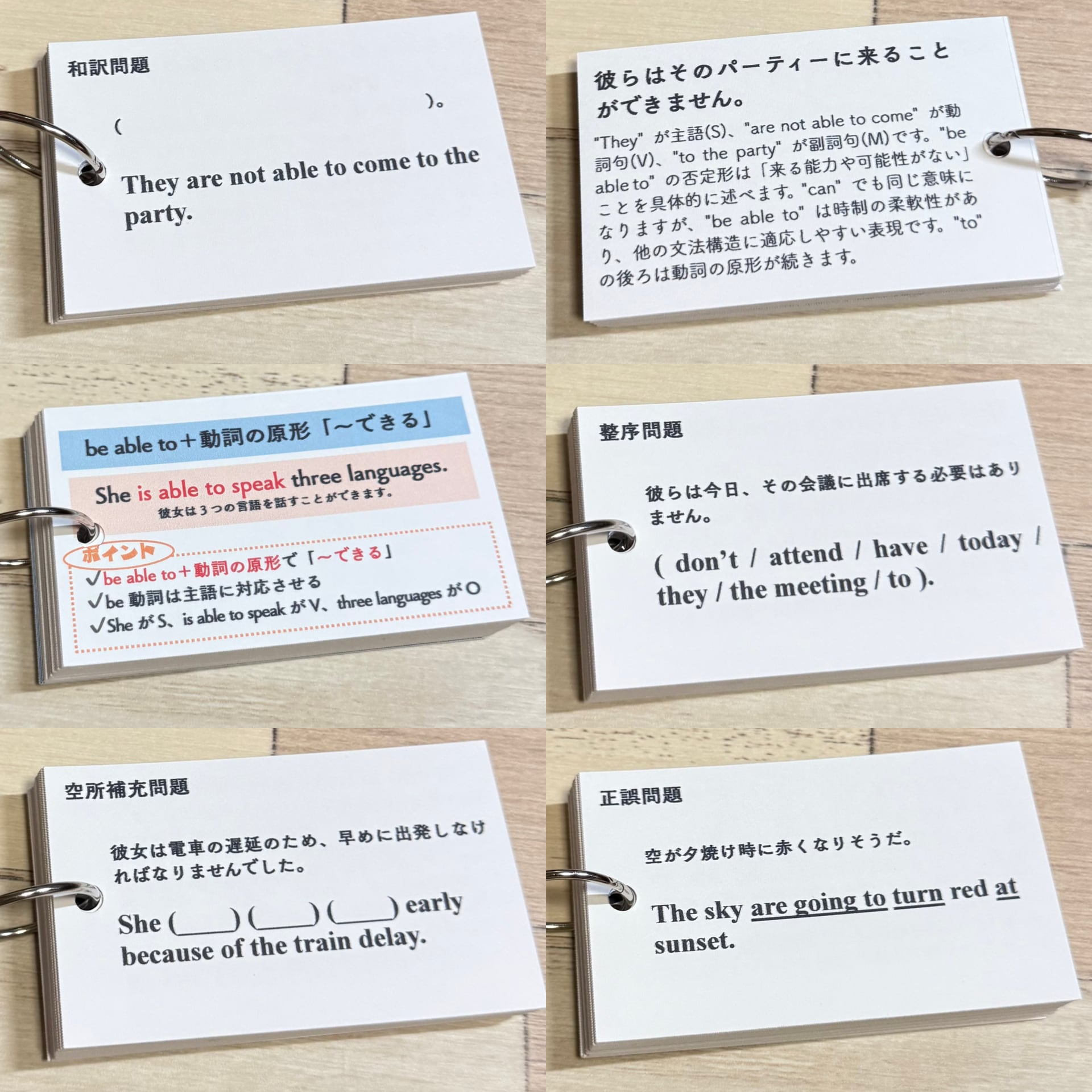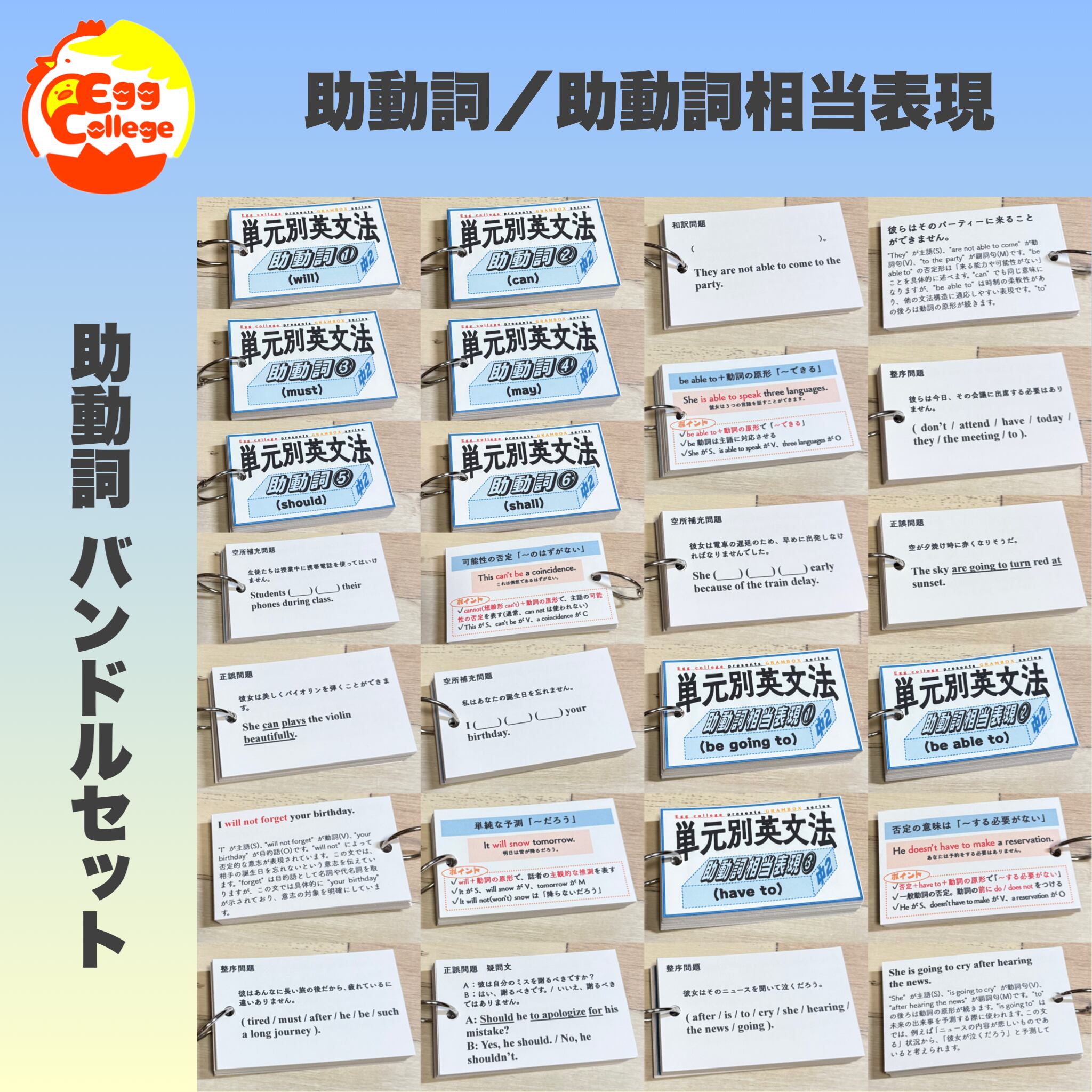 本商品の《バンドルセット》は、全64項目の中から関連する項目(例:「不定詞基礎+応用」「助動詞+助動詞相当表現」など)を組み合わせたセットです。特定の文法分野を体系的にまとめて学習できるため、知識を効率よく整理・定着させたい方におすすめです。