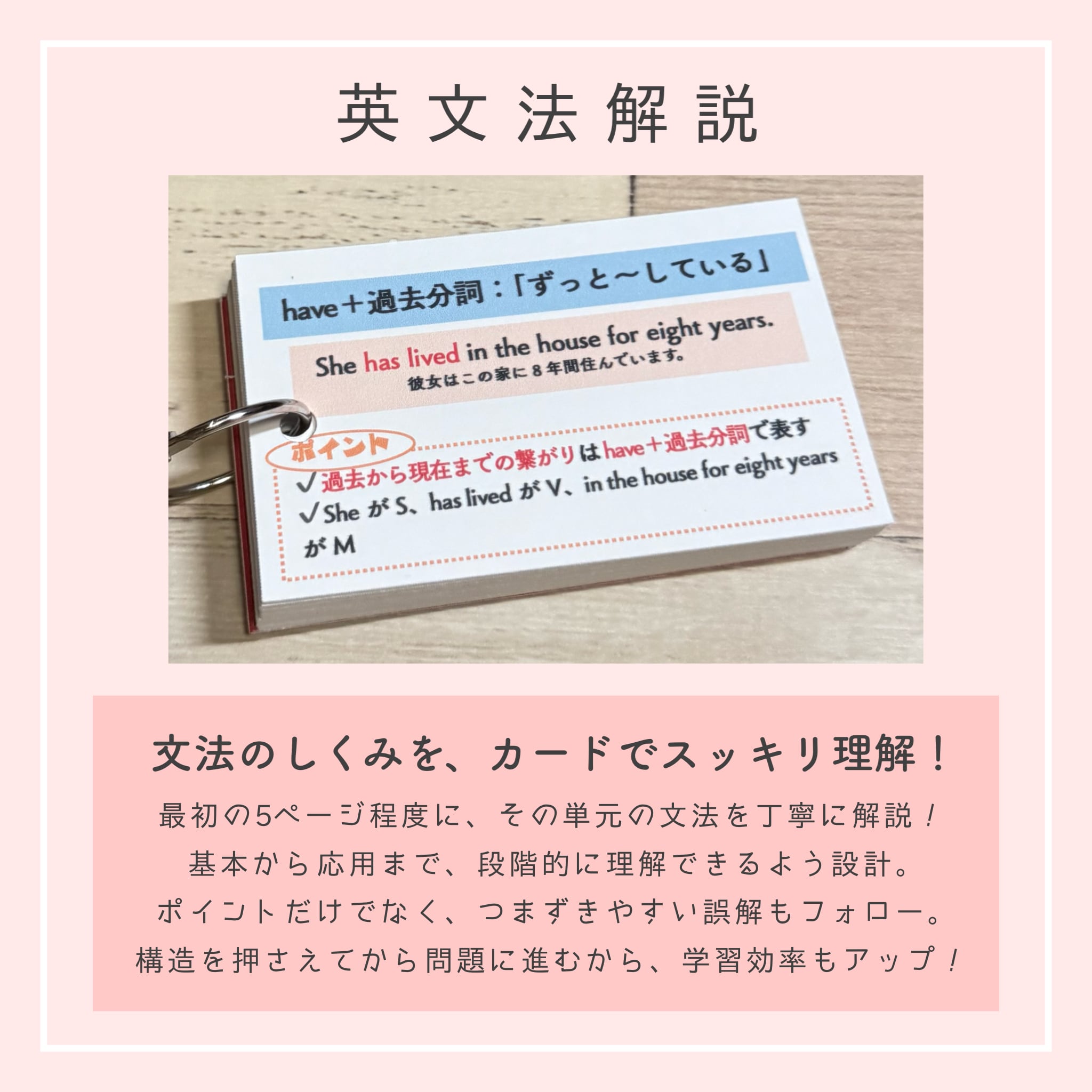 それぞれのカードには、該当文法の丁寧な解説と、整序・空所補充・和訳・正誤問題を合計40問以上収録。裏面には解答とともにSVOCM構造と詳しい解説があるため、文法知識に加えて、英文解釈・構文の見抜き方まで自然と身につくのが本商品の大きな特長です。