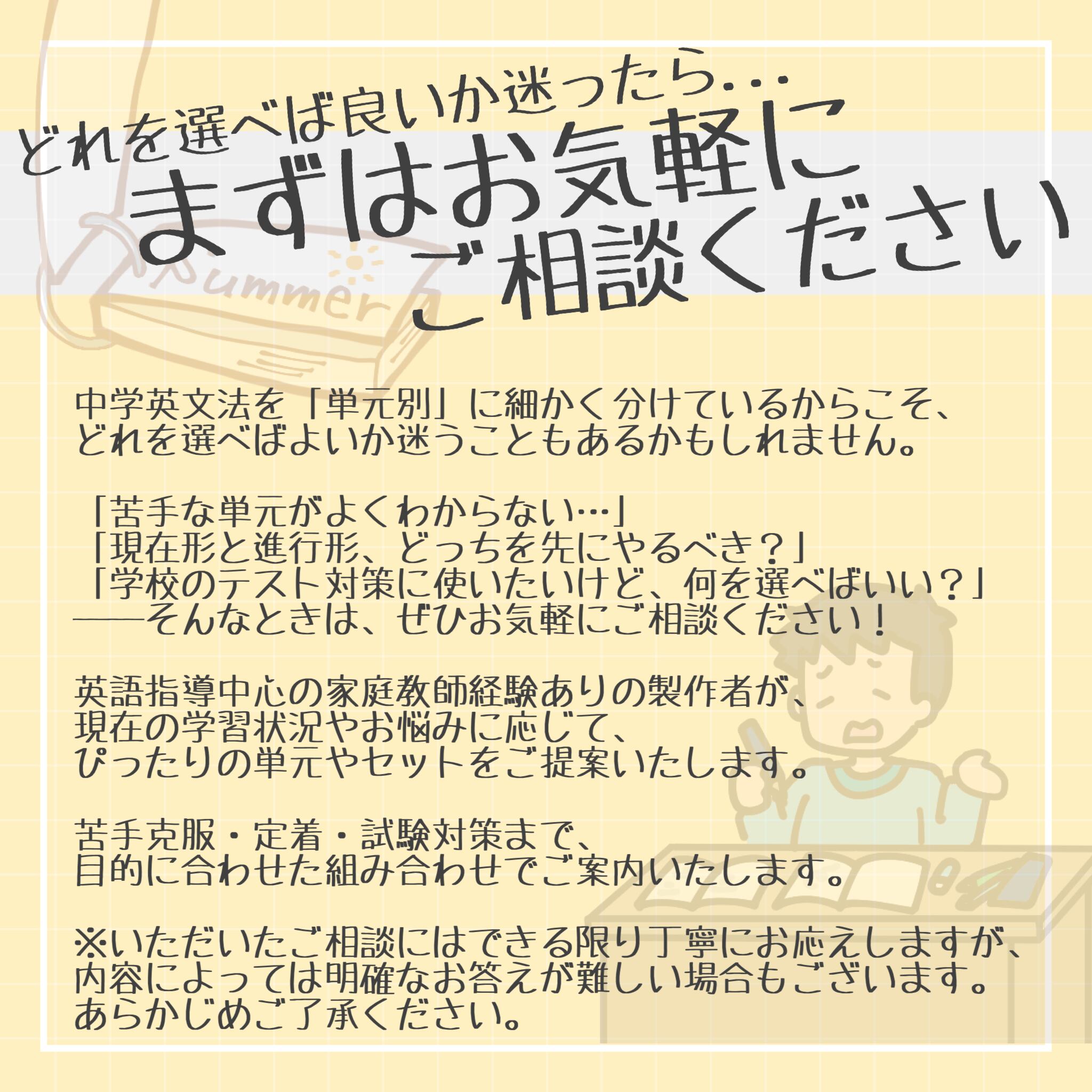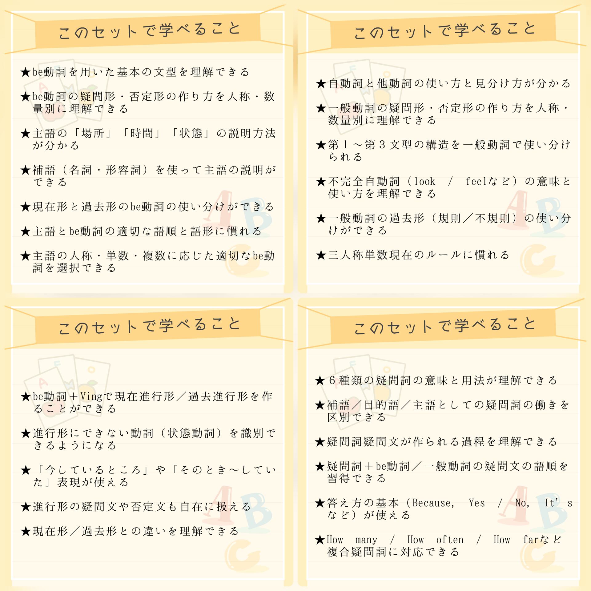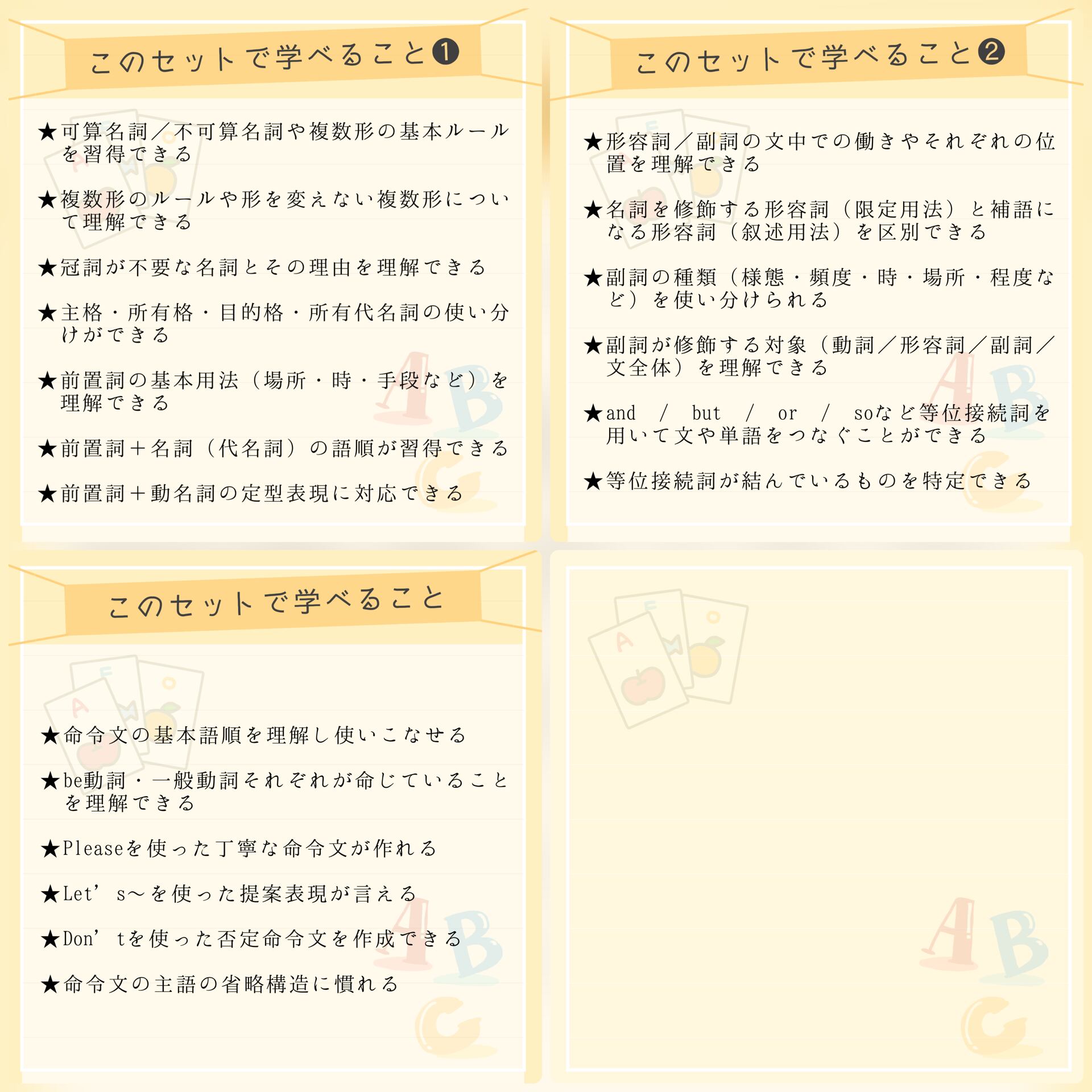 本商品の《フルパッケージ》は、中学各学年に対応する文法項目をすべて収録しており、総復習や基礎固めに最適な構成となっています。