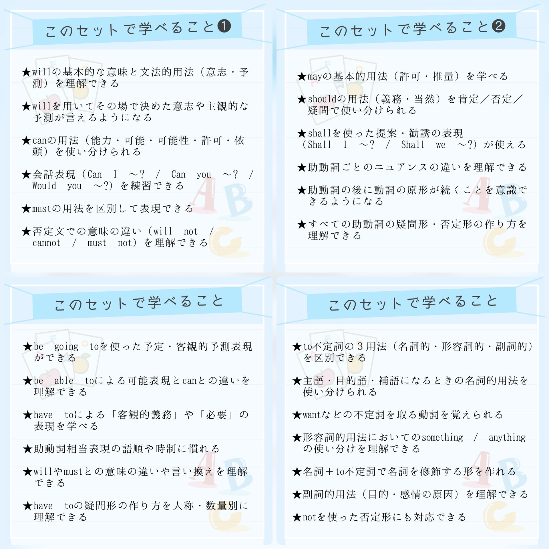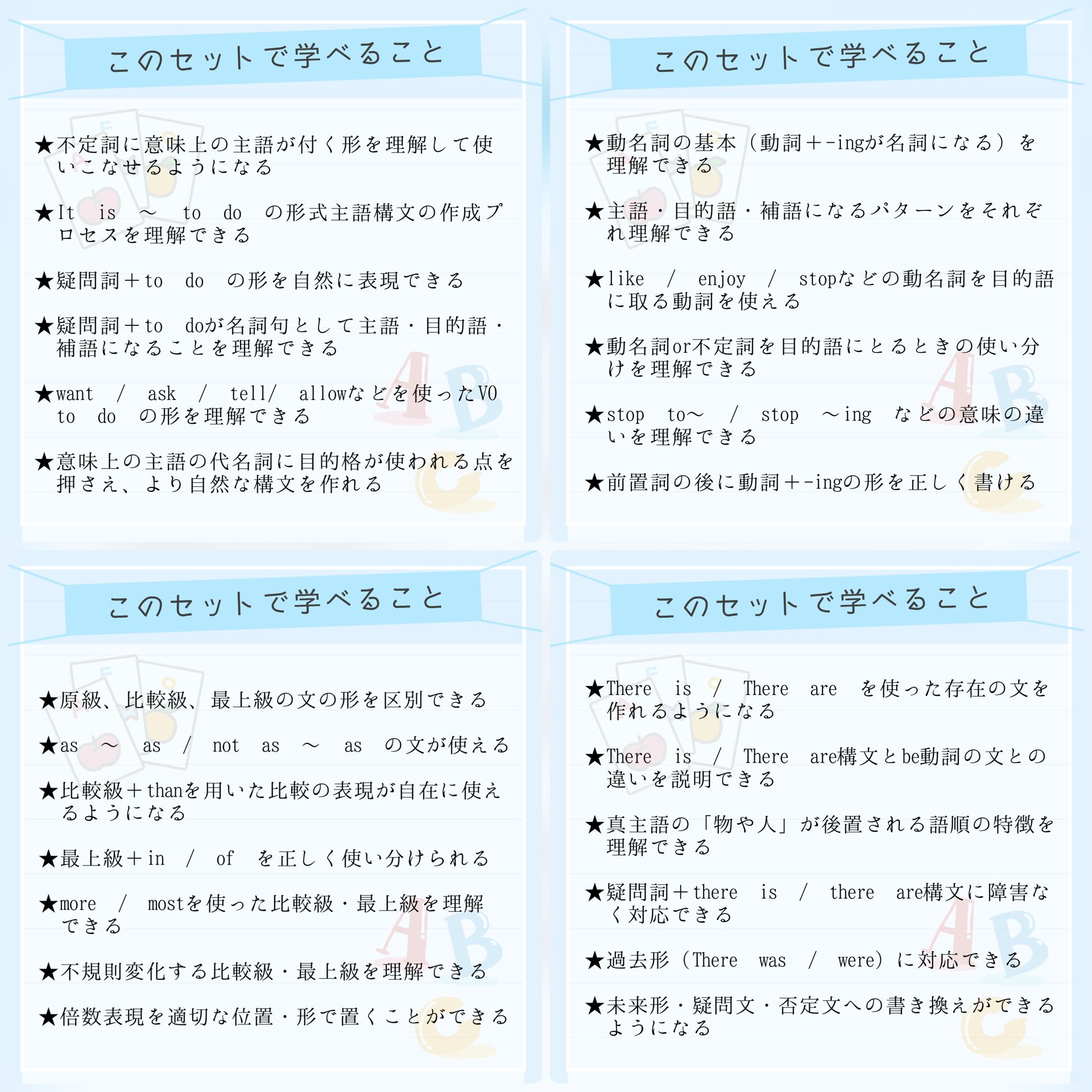 本商品の《フルパッケージ》は、中学各学年に対応する文法項目をすべて収録しており、総復習や基礎固めに最適な構成となっています。