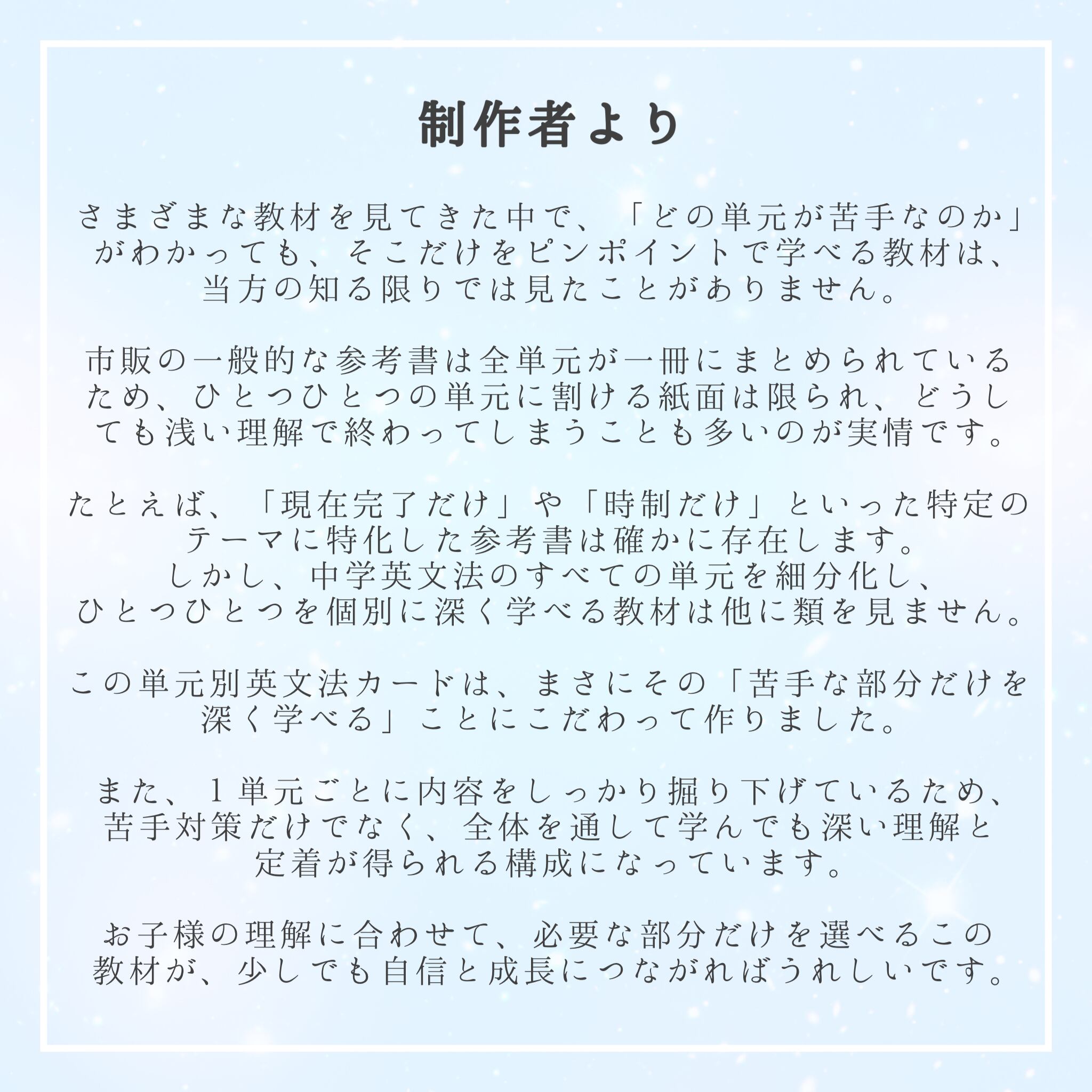 単元別英文法カードは、中学英文法を全64項目に細分化し、単元グループ別、テーマ別、学年別等ごとにお求めいただける学習カードです。