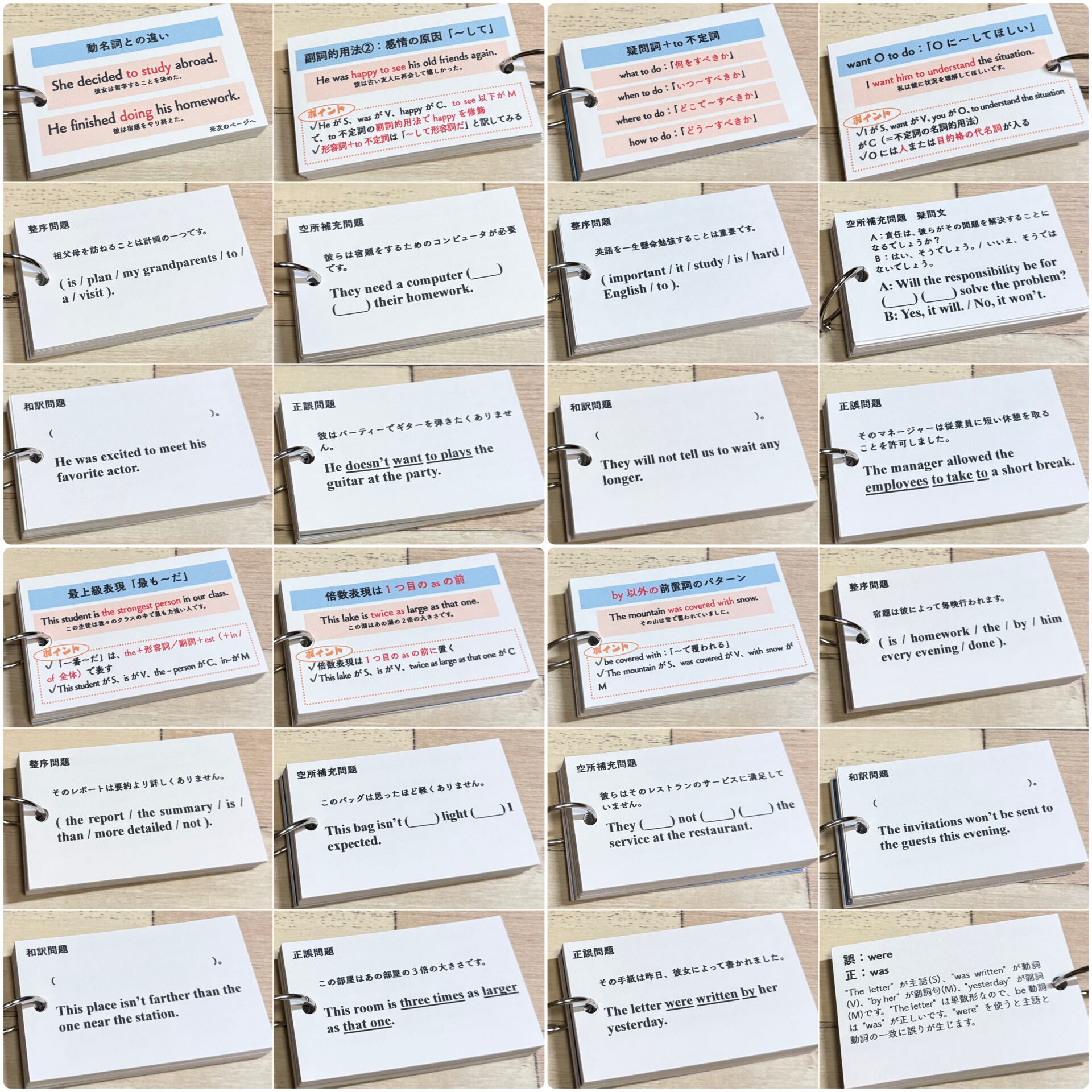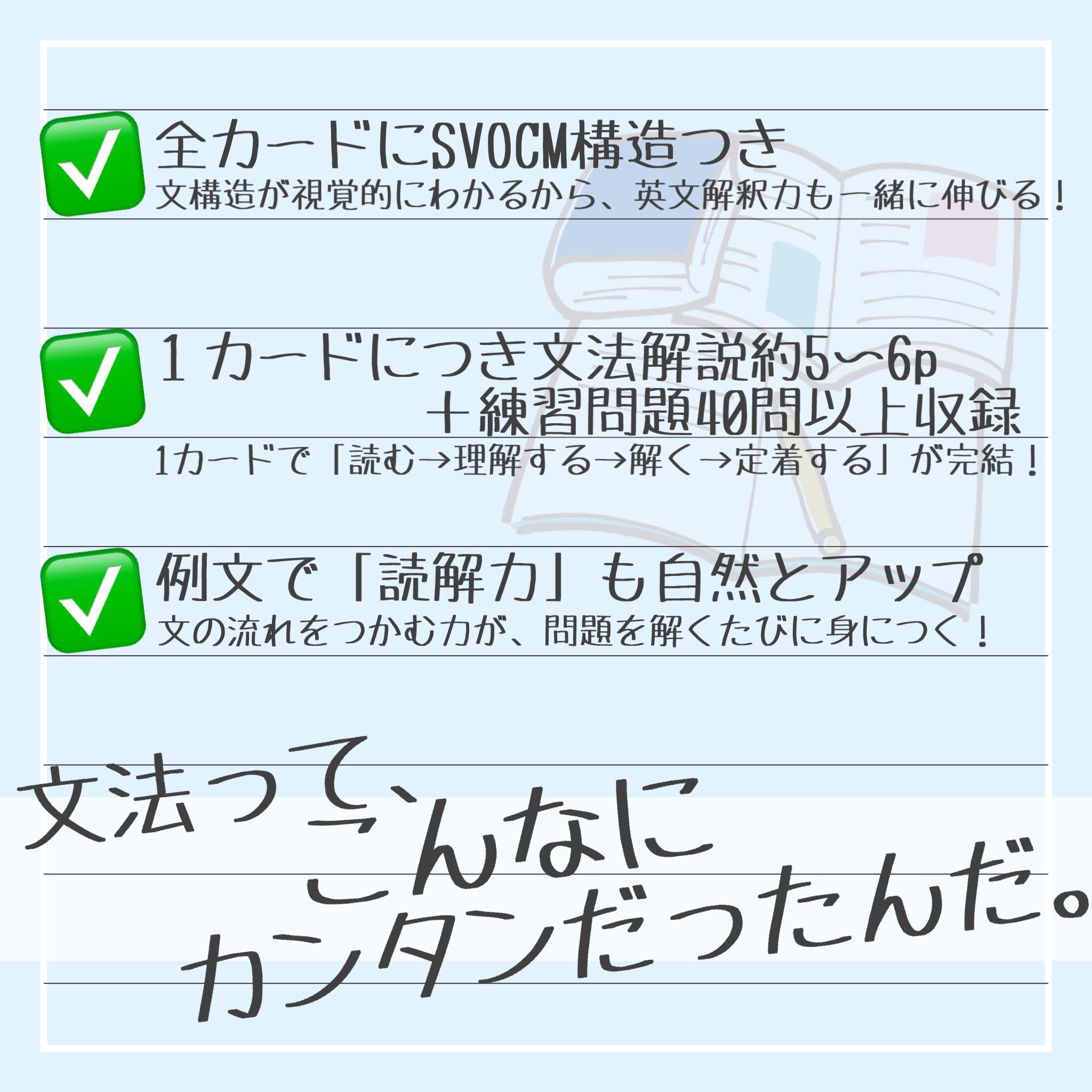 それぞれのカードには、該当文法の丁寧な解説と、整序・空所補充・和訳・正誤問題を合計40問以上収録。裏面には解答とともにSVOCM構造と詳しい解説があるため、文法知識に加えて、英文解釈・構文の見抜き方まで自然と身につくのが本商品の大きな特長です。