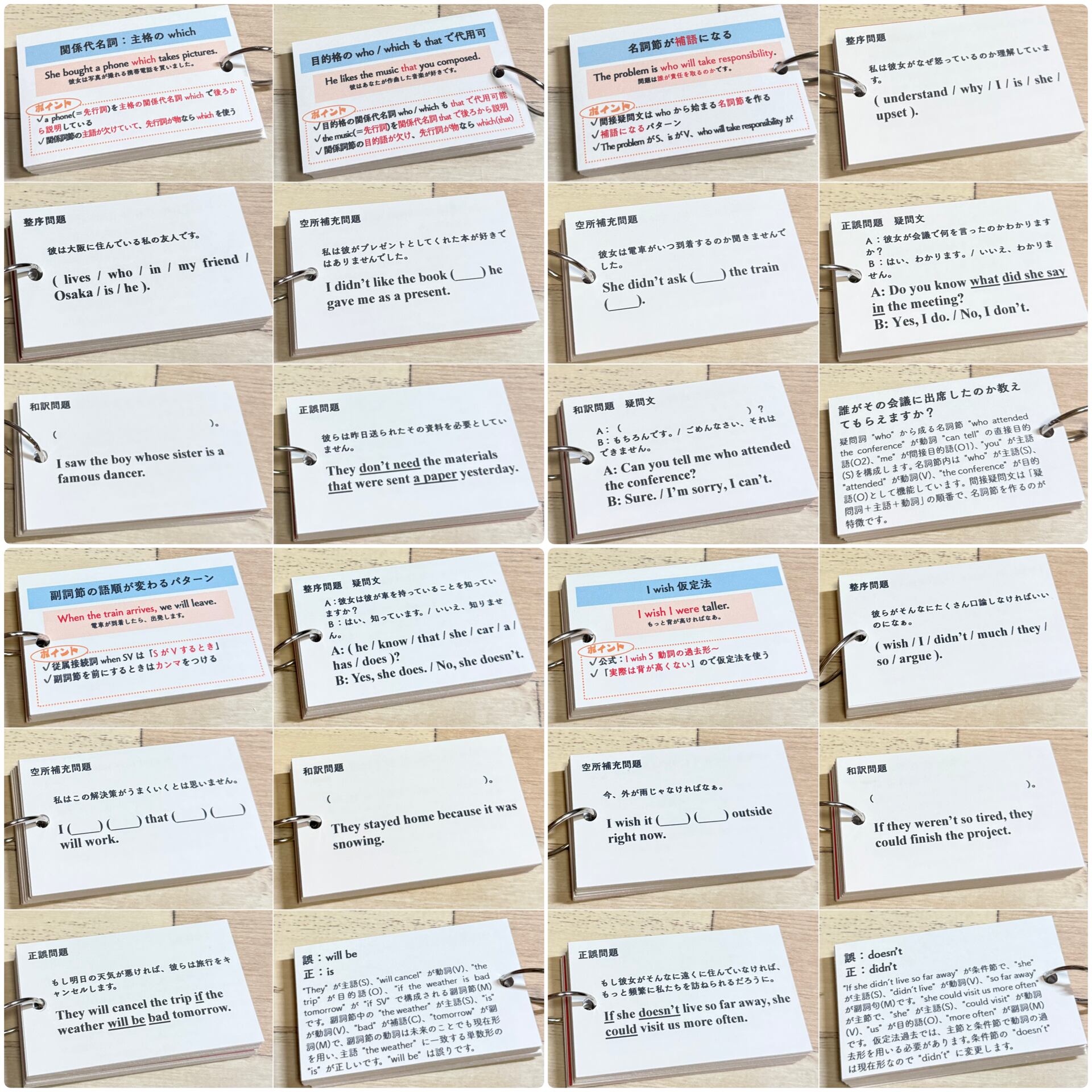 それぞれのカードには、該当文法の丁寧な解説と、整序・空所補充・和訳・正誤問題を合計40問以上収録。裏面には解答とともにSVOCM構造と詳しい解説があるため、文法知識に加えて、英文解釈・構文の見抜き方まで自然と身につくのが本商品の大きな特長です。