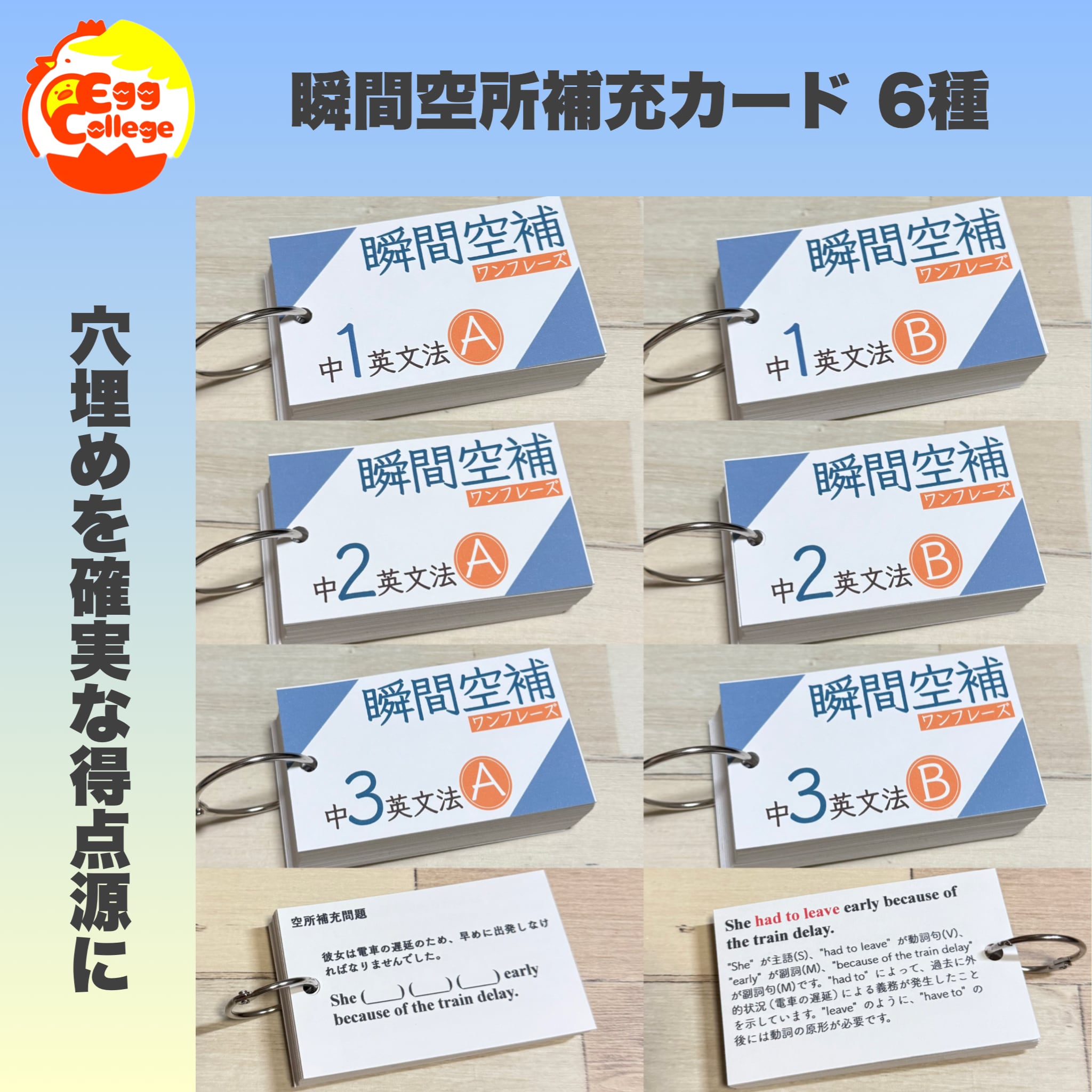 瞬間空所補充カード 6種セット 高校受験 高校入試 中学英語 中学3年間 中学英文法 期末テスト 夏休み 復習 自主学習 定期テスト 中間テスト 復習テスト 速読 暗記カード 参考書 中学生 高校生