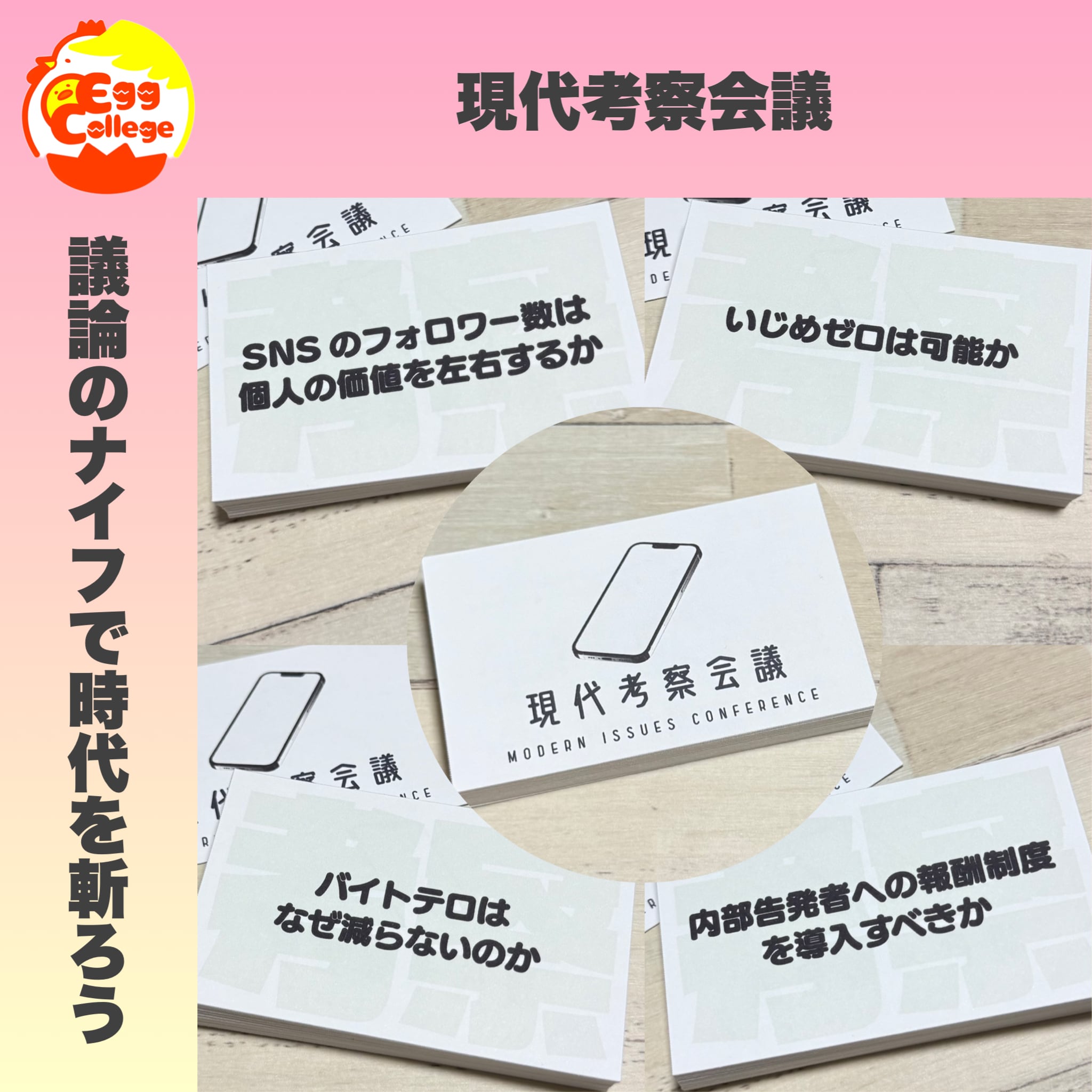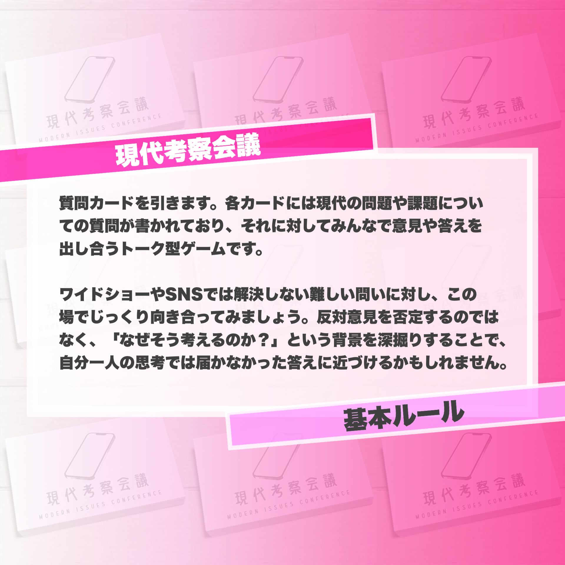 現代社会の問題や課題をテーマに、プレイヤー同士でじっくりと意見を交わし合うトーク型ゲームです。