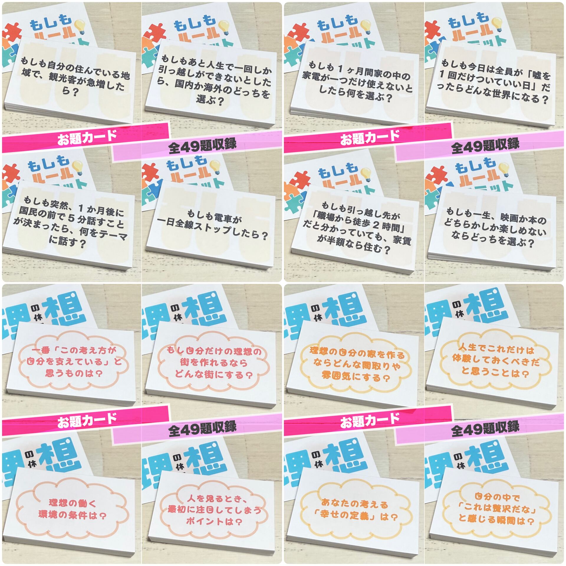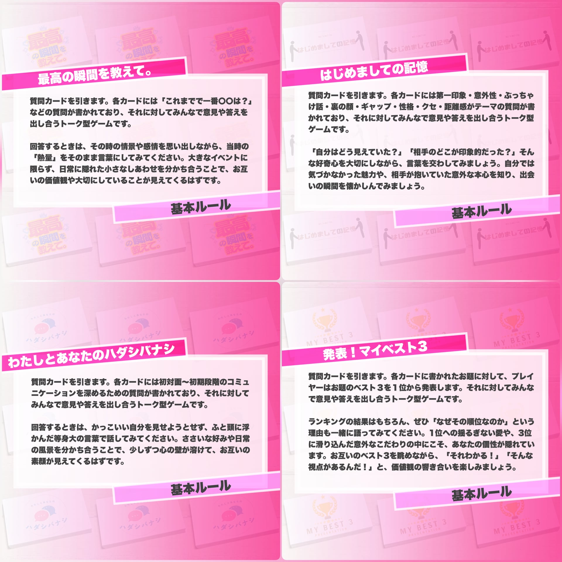 すべてのゲームは、ルール説明1分ですぐに遊べるシンプル設計。家族や友人とはもちろん、パーティーや価値観を知り合う場面まで、あらゆるシーンの会話を劇的に弾ませるコンプリートパックです。