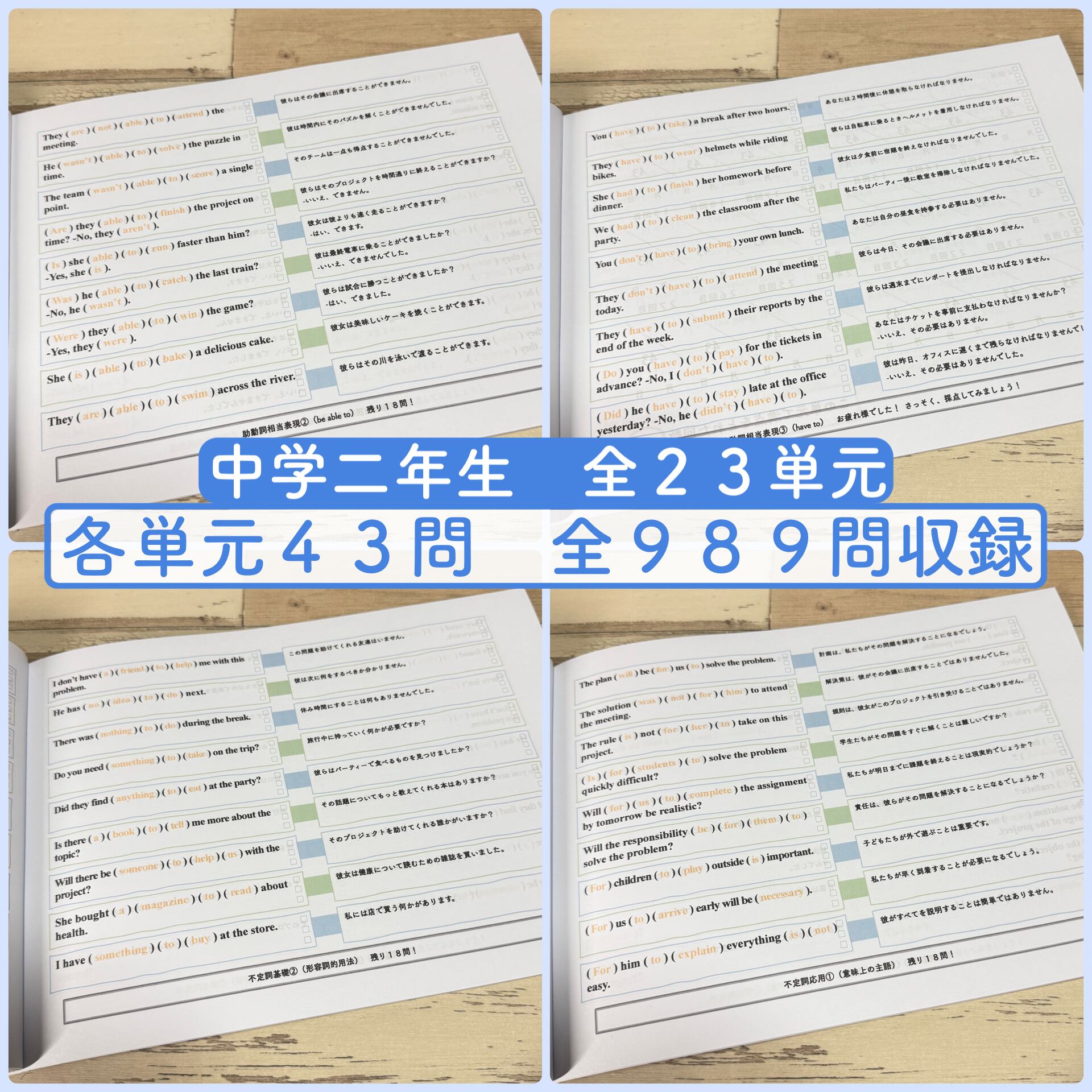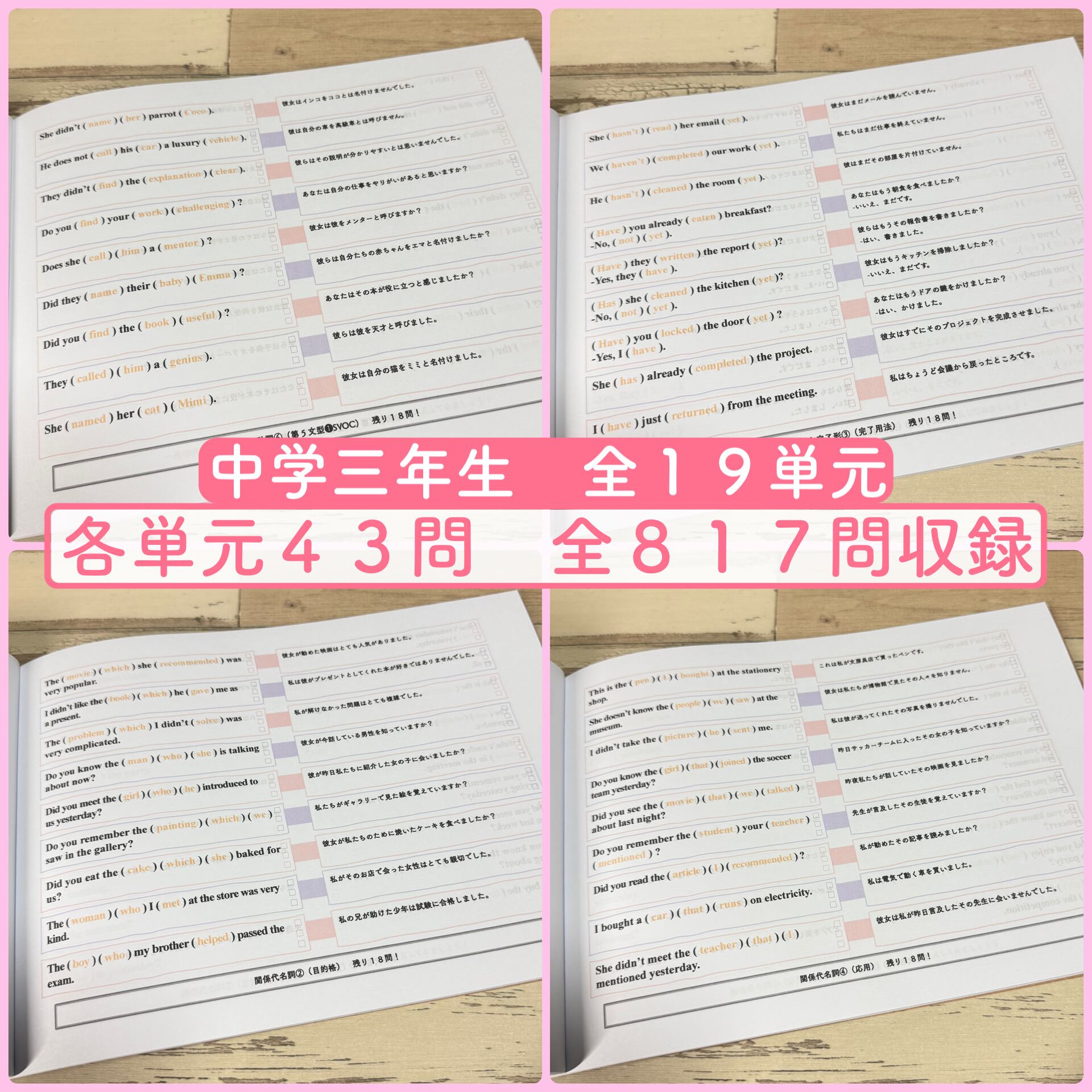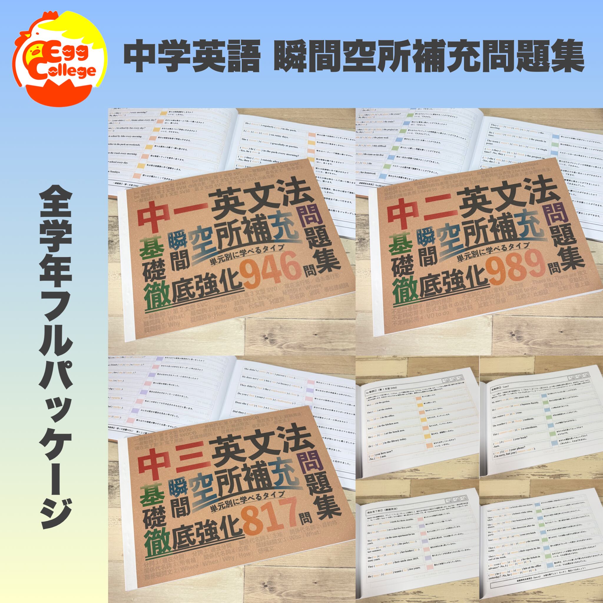 中学英文法の全範囲から、空所補充問題を収録した問題集。全学年コンプリートセットです。
